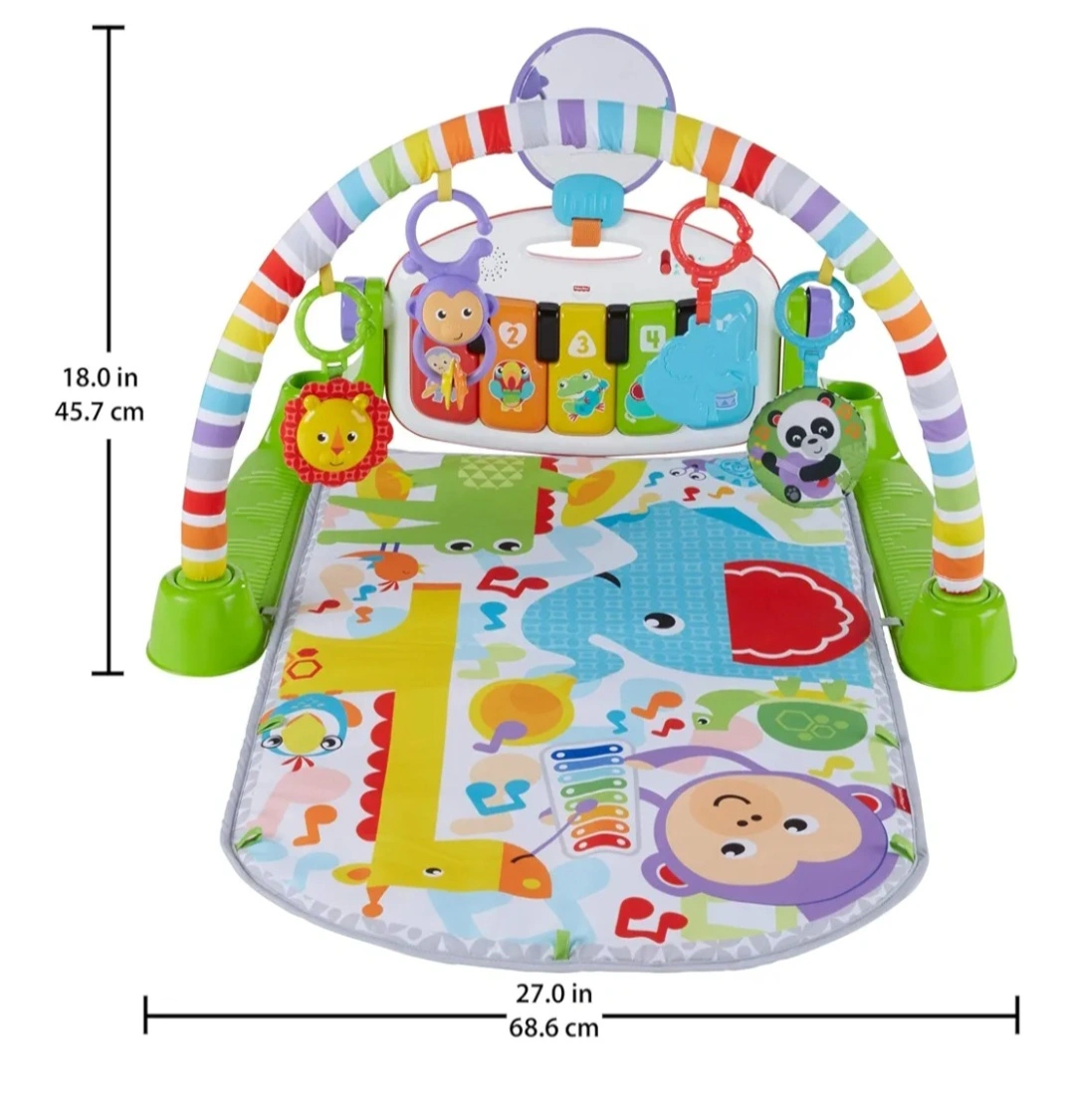 This Fisher-Price Deluxe Kick & Play Piano Gym in green is perfect for your little one! The playmat style gym features a piano that baby can kick to activate music and sounds. It includes various toys to stimulate baby's senses and encourage development. Dimensions are approximately 18 inches in height and 27 inches in width. Retails for $75 + tax