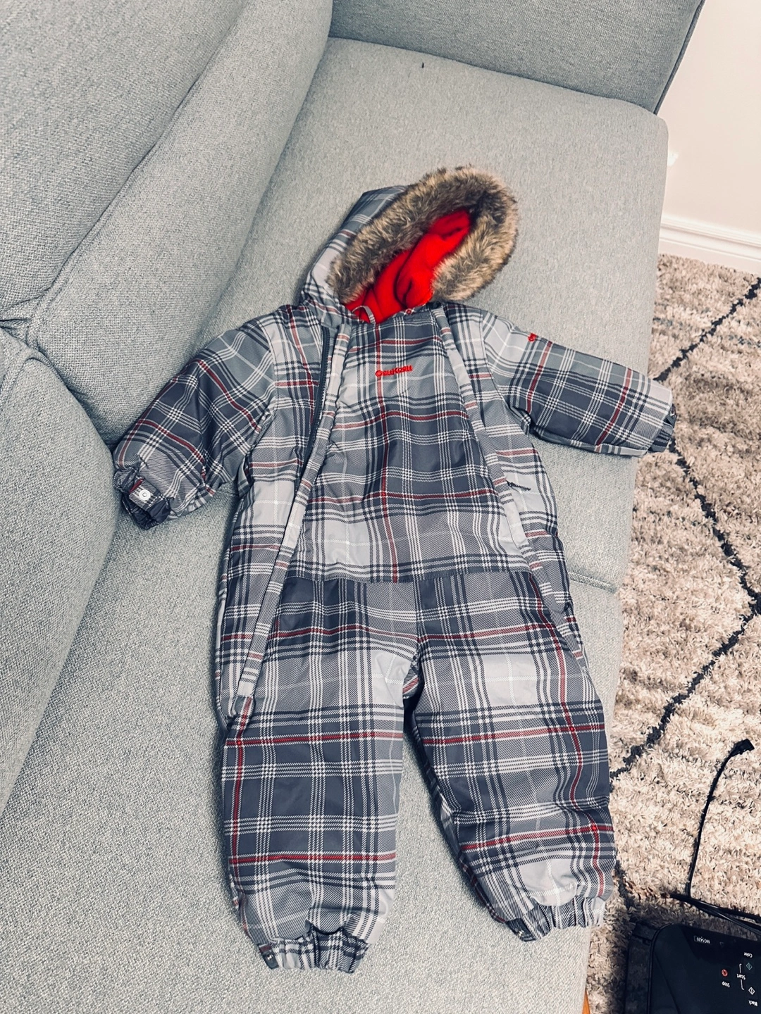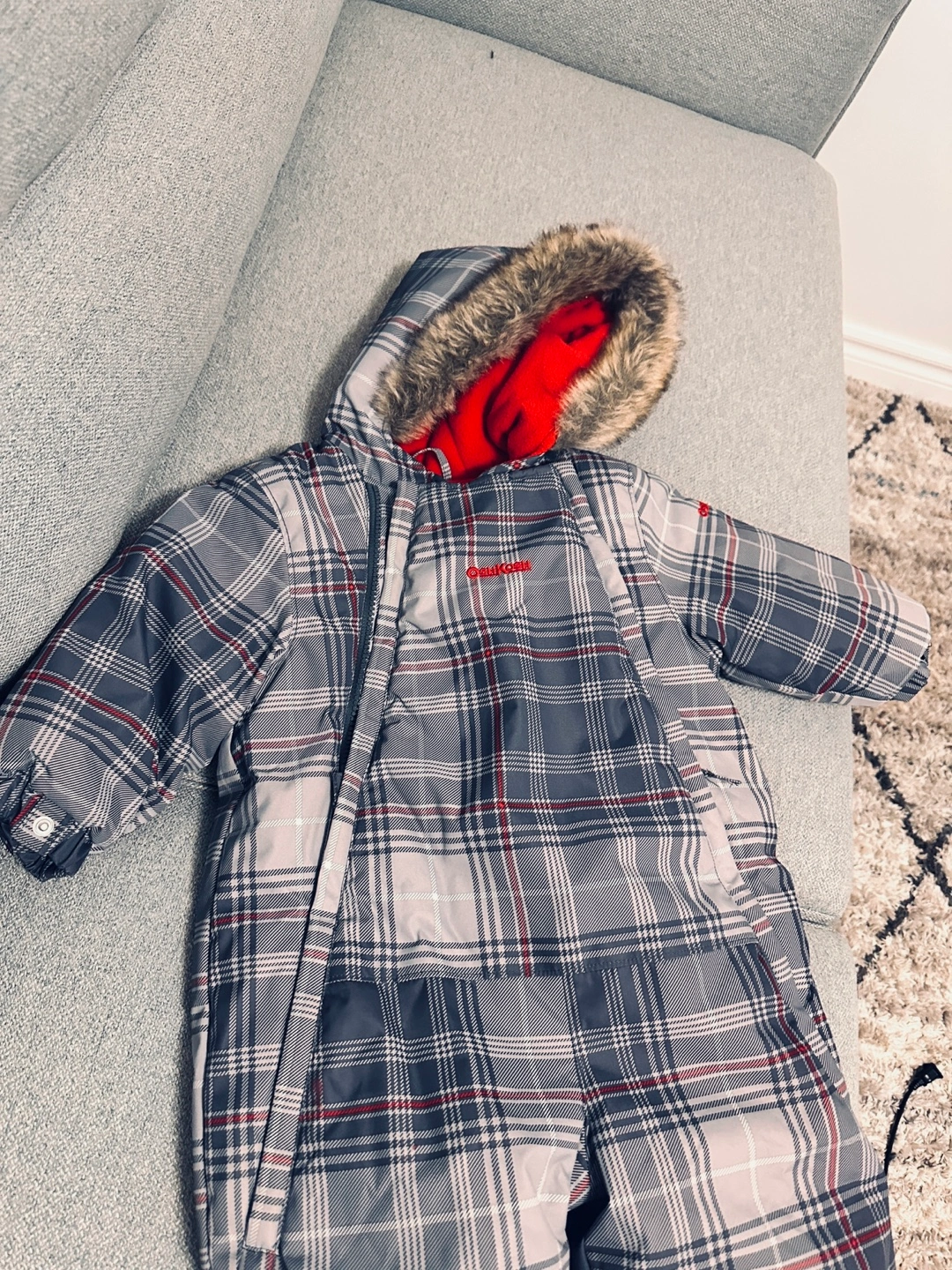 Cozy OshKosh B'gosh snowsuit in a stylish grey and red plaid pattern! It features a warm red fleece lining and a faux fur trimmed hood to keep your little one snug during the colder months. Size is 18 months.