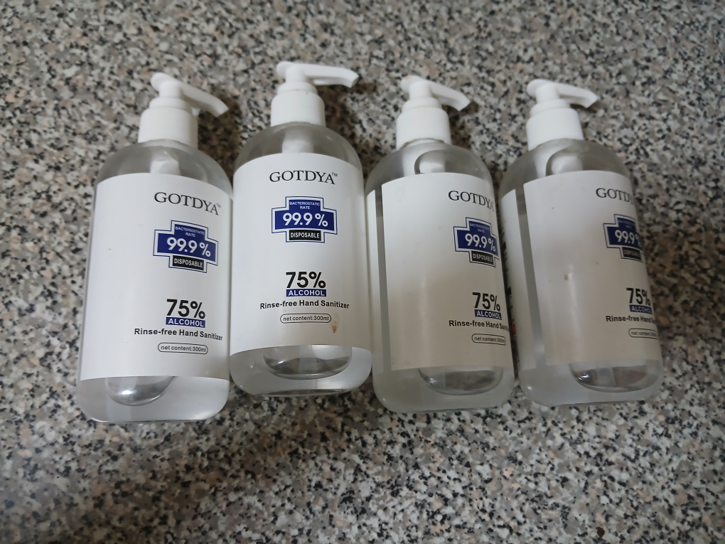 Selling four bottles of GOTDYA Rinse-free Hand Sanitizer. Each bottle contains 300ml of 75% alcohol solution, perfect for keeping your hands clean and sanitized on the go!