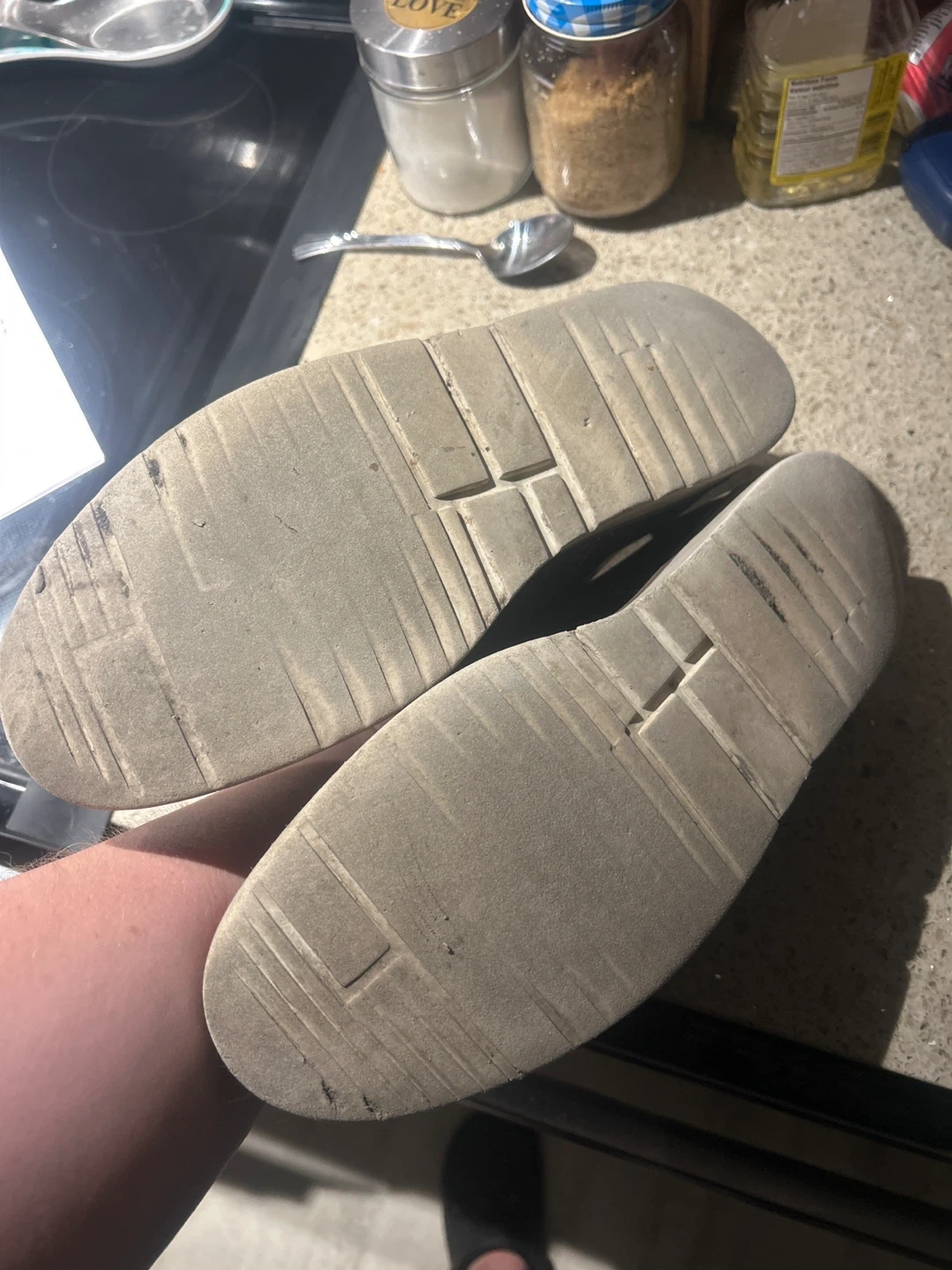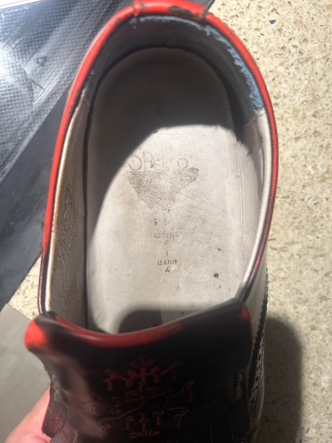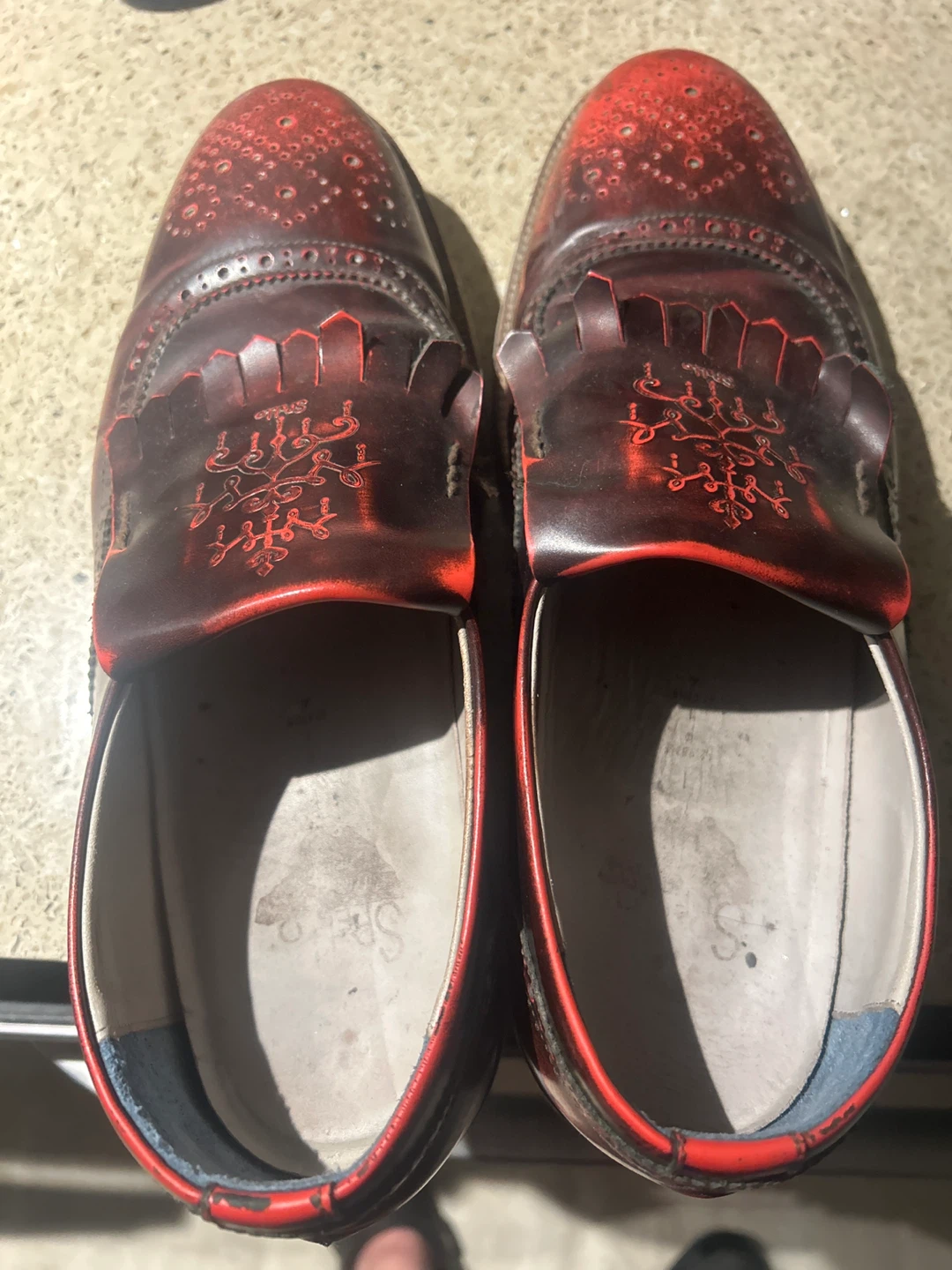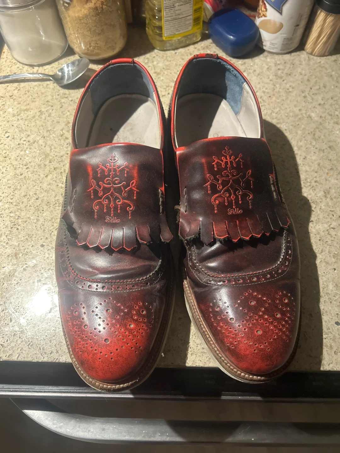 Pair of Spello Italian leather dress shoes. They are a men’s size 10. They have a unique red and brown colour. They show signs of wear, but are very comfortable and still have lots of life left!