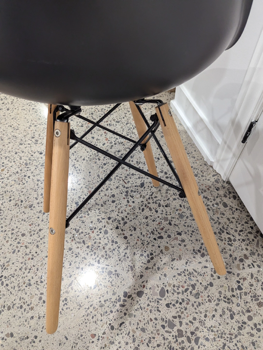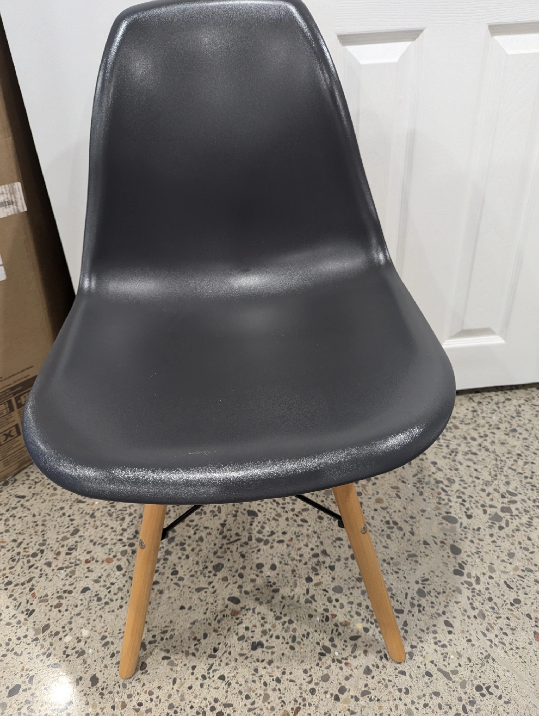 Here's a stylish charco plastic shell chair with light wood legs! It's in good shape and would look great in any room. The chair is perfect for adding a modern touch to your home. It's ready for a new home!