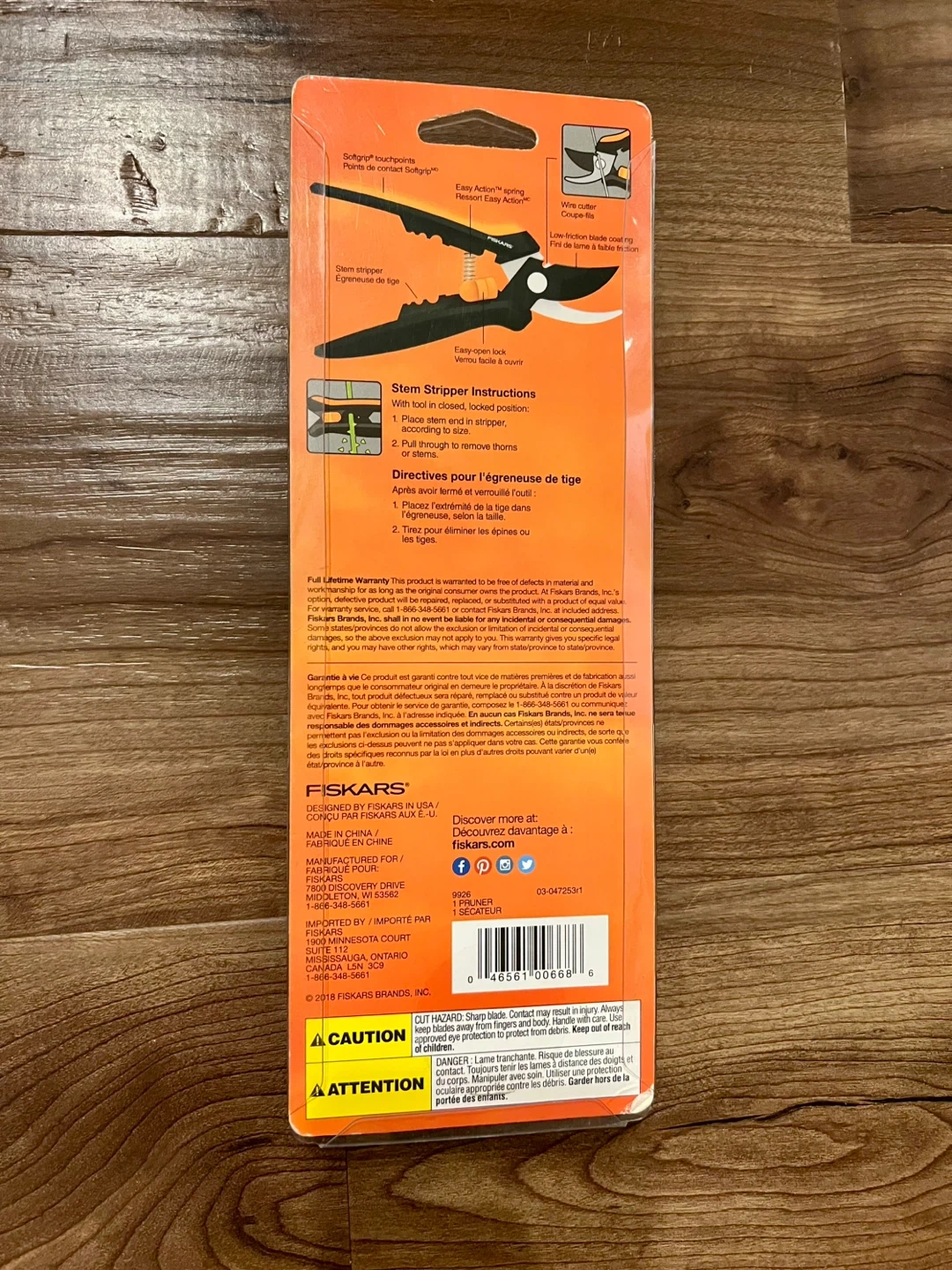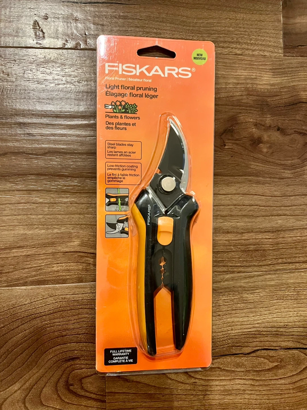 Selling a brand new Fiskars Floral Pruner, perfect for light floral pruning! The steel blades stay sharp, and it features a low-friction coating to prevent damage. It also has Softgrip touchpoints for comfortable use and an Easy Action spring for easy cutting. Includes stem stripper instructions on the back of the packaging