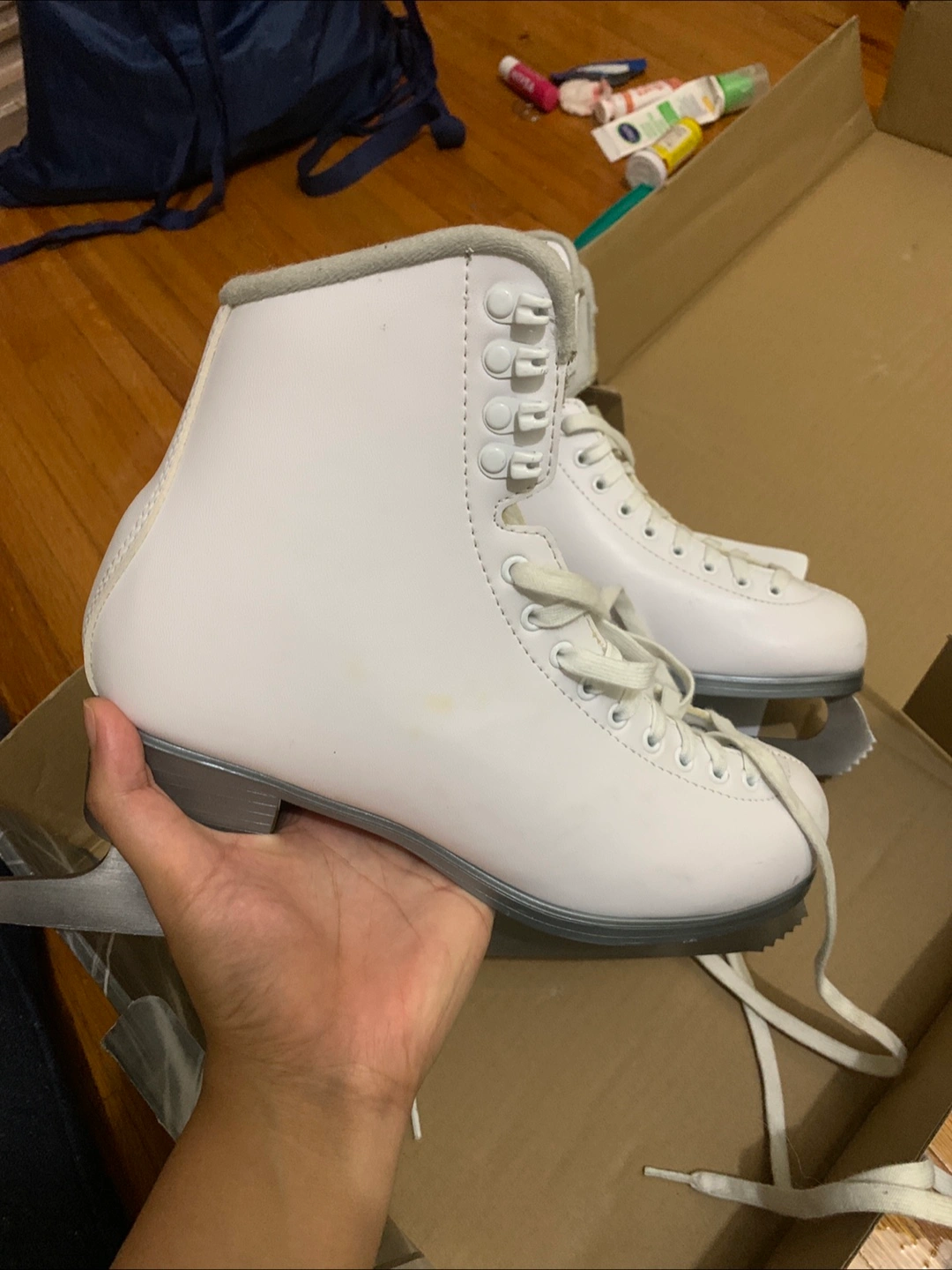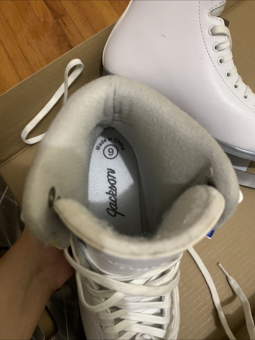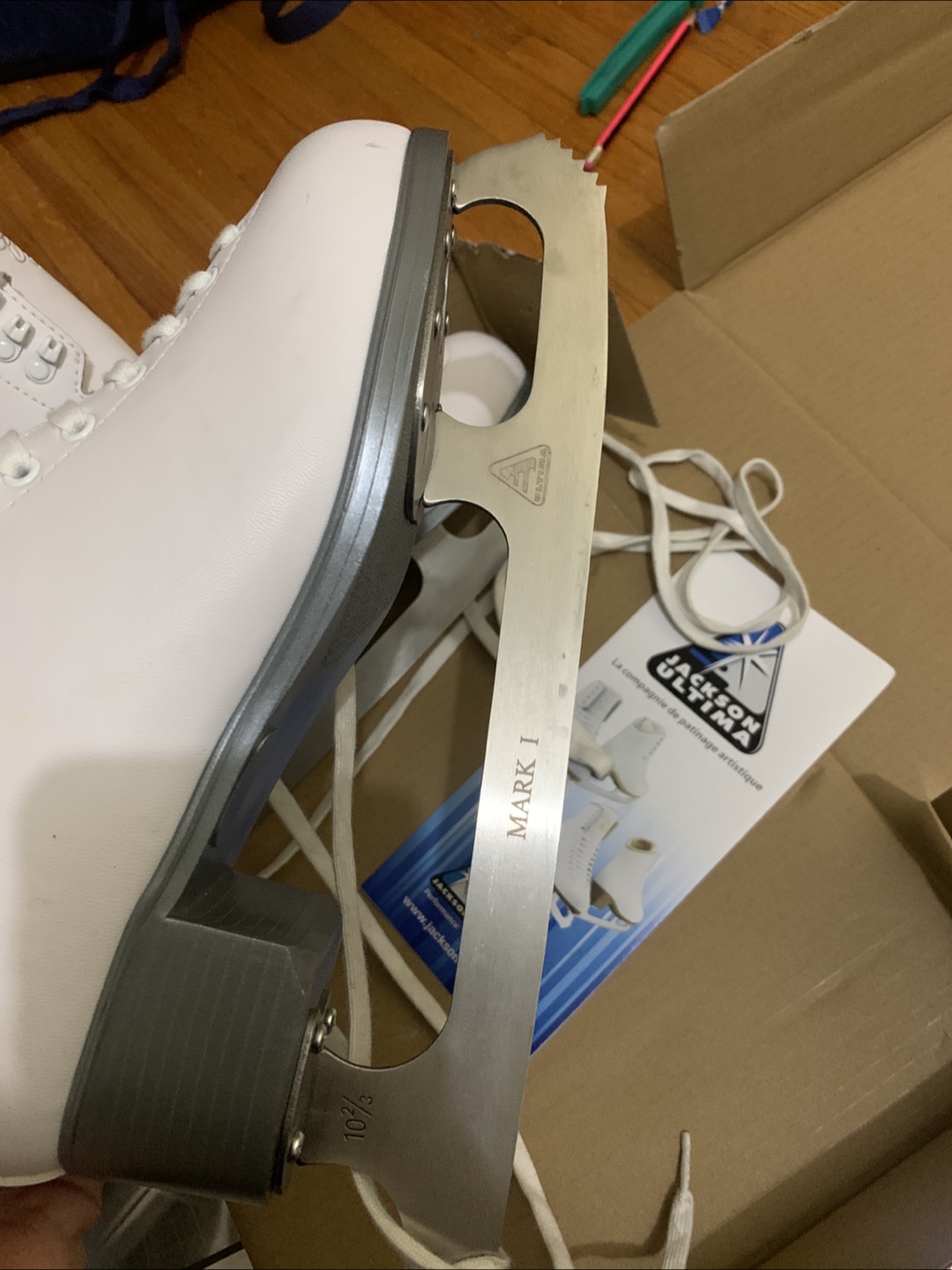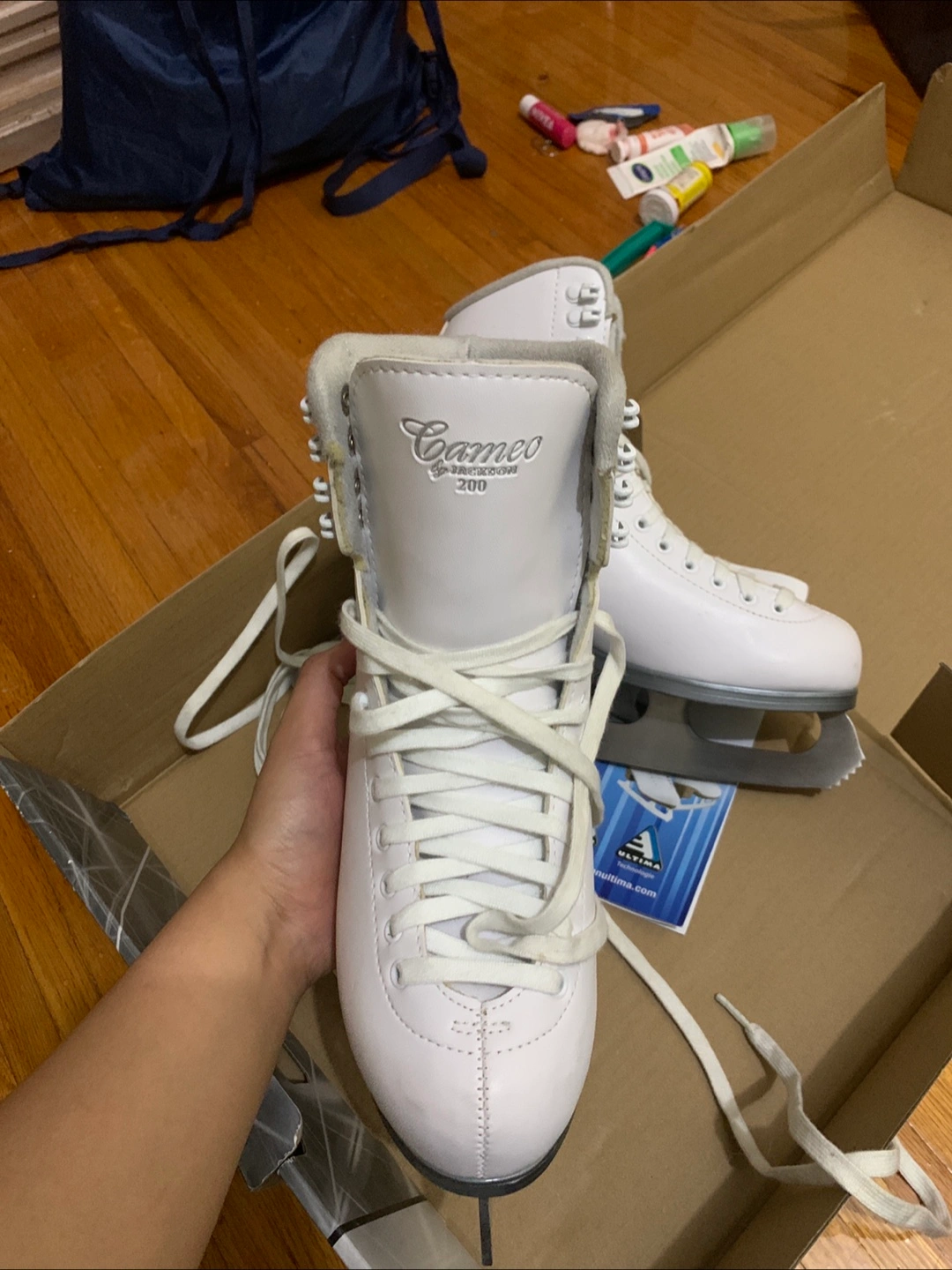Women’s ice skates used once only. Selling a pair of Jackson Cameo 200 ice skates in size 9. They are white and in good condition. The blades are Jackson Ultima Mark I. Comes with the original box!