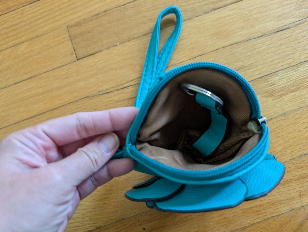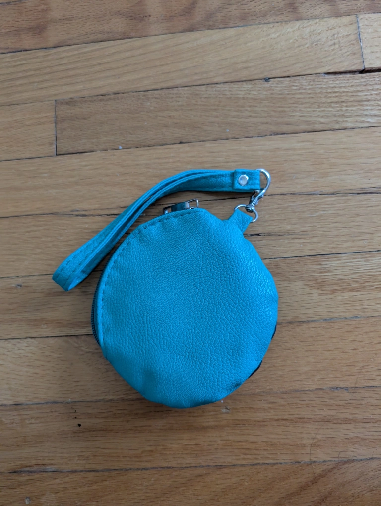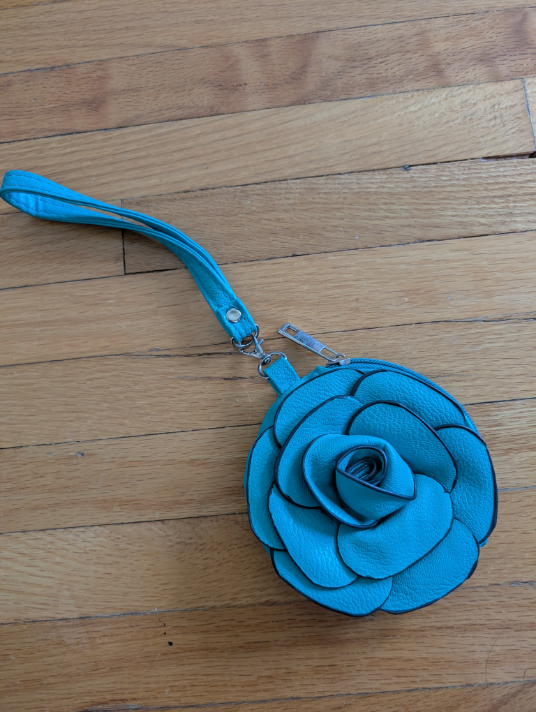 This is a cute turquoise flower-shaped coin purse! It has a zipper closure and a wrist strap for easy carrying. Perfect for keeping your coins and small items organized.