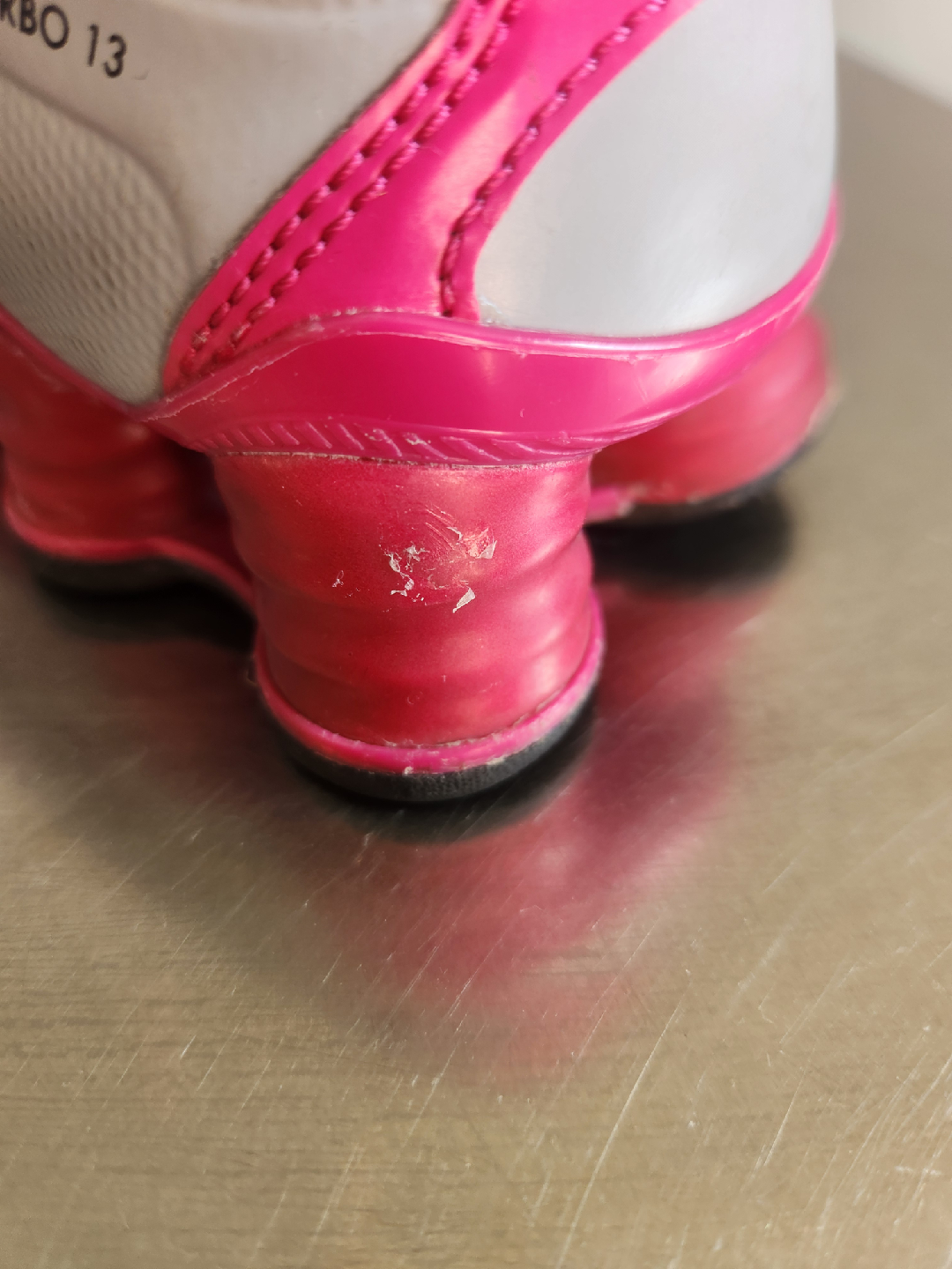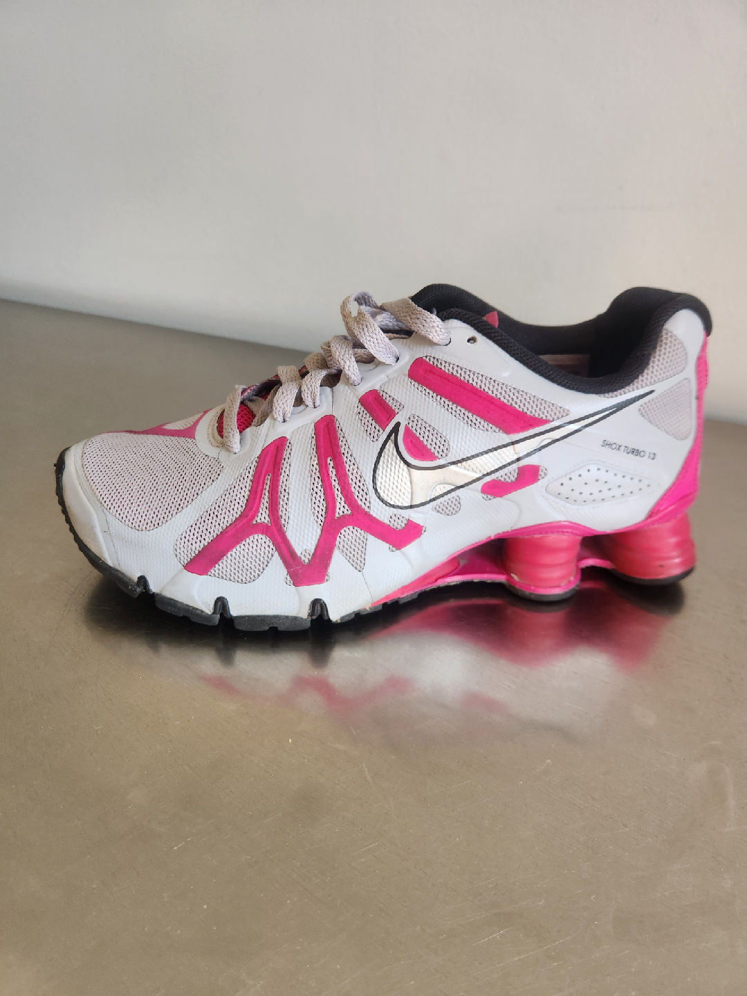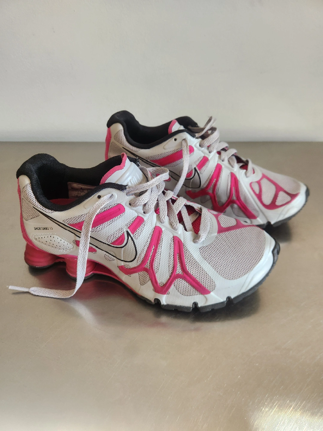 Selling a pair of Nike Shox Turbo 13 7.5 women's running shoes. They show some signs of wear, particularly on the soles, but are still in good condition for running or casual wear. The shoes feature a white and pink colour scheme with the classic Nike swoosh. Please check the photos for a closer look!
