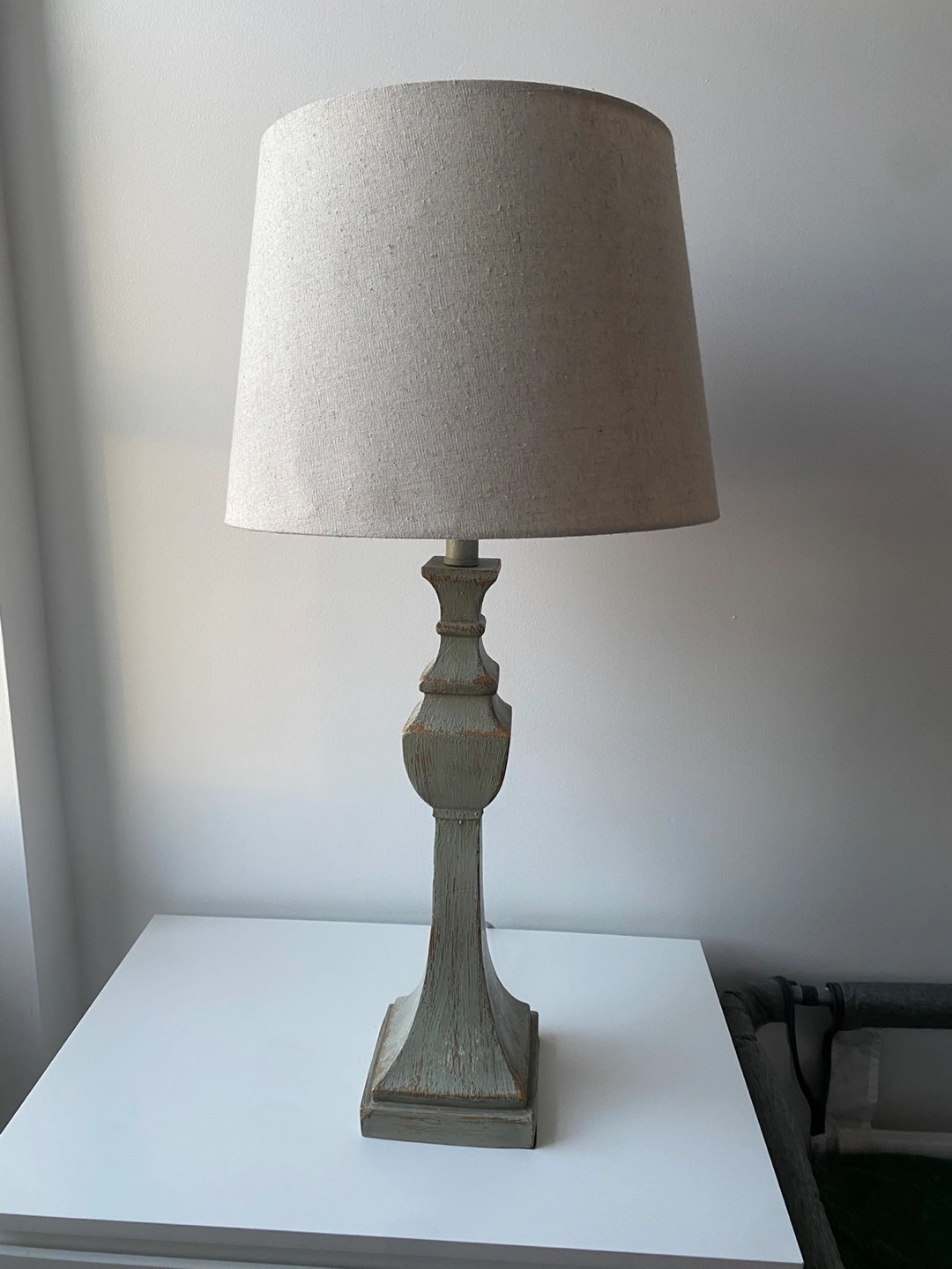 Selling a nice table lamp with a beige shade. It has a wooden base with a unique design. It will add a cozy touch to any room.