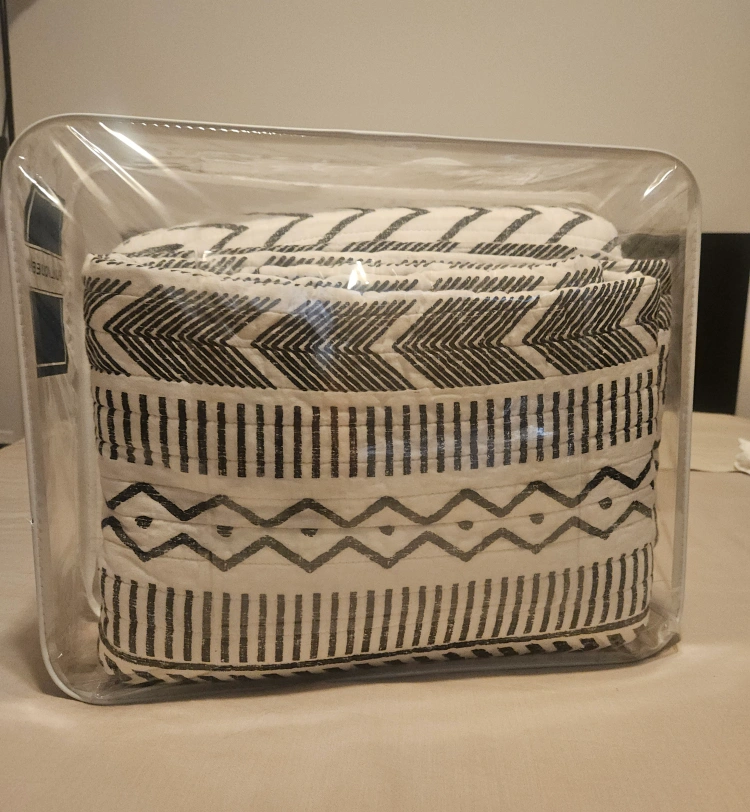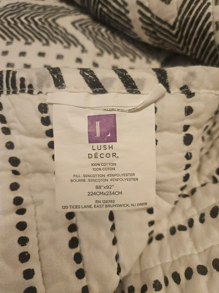 This is a Lush Decor quilt bed spread,king size. The dimensions are 88" x 92". It's made of 100% cotton with a 55% cotton, 45% polyester fill. It's in great condition and comes in zipped. plastic bag protection.