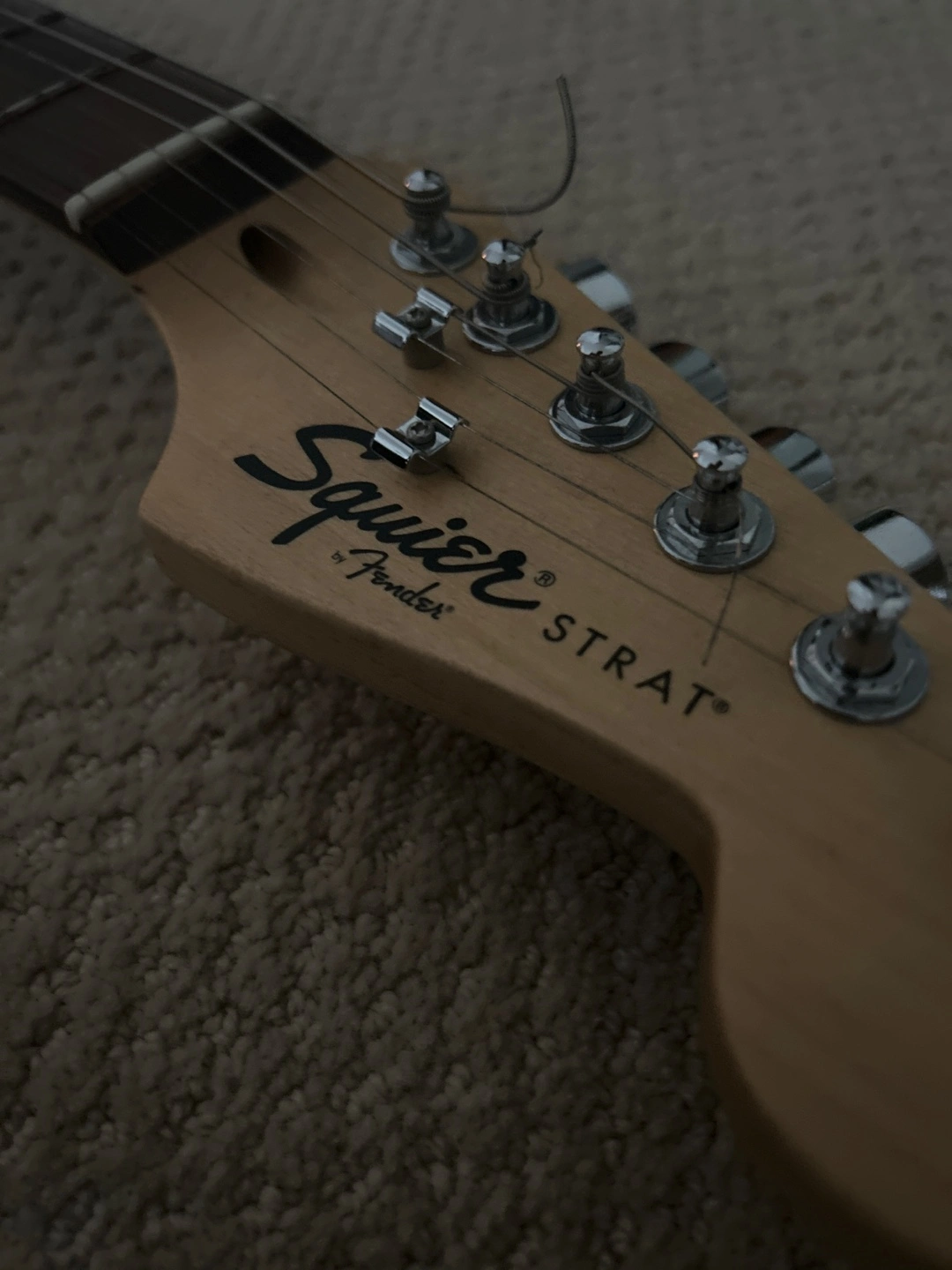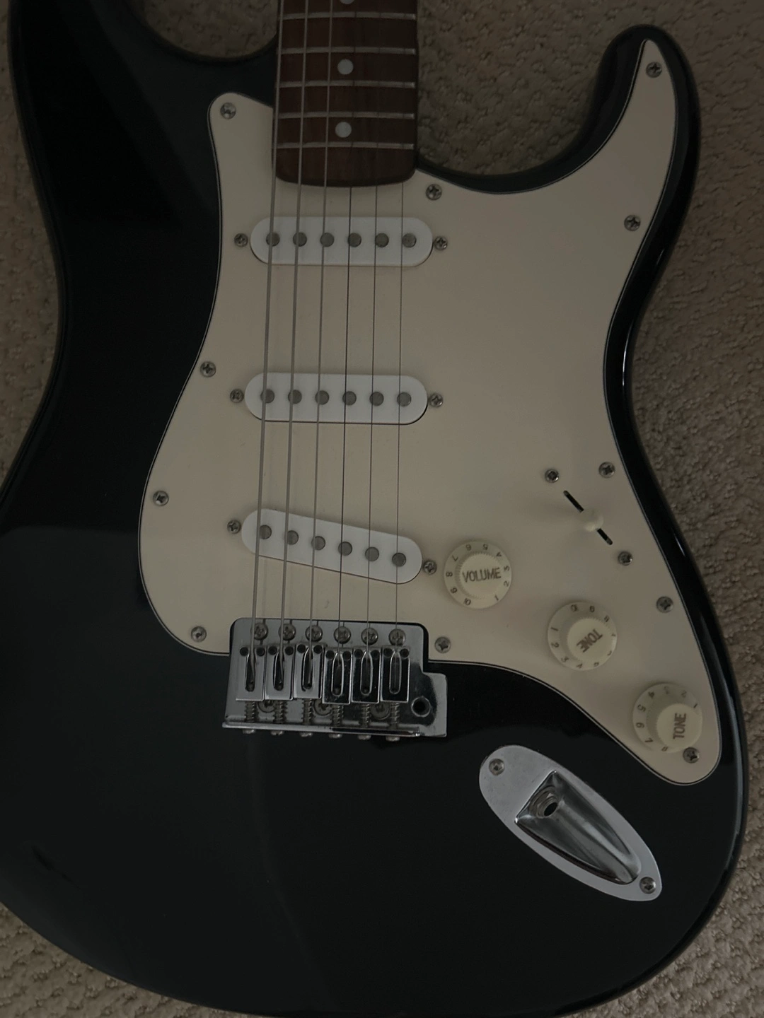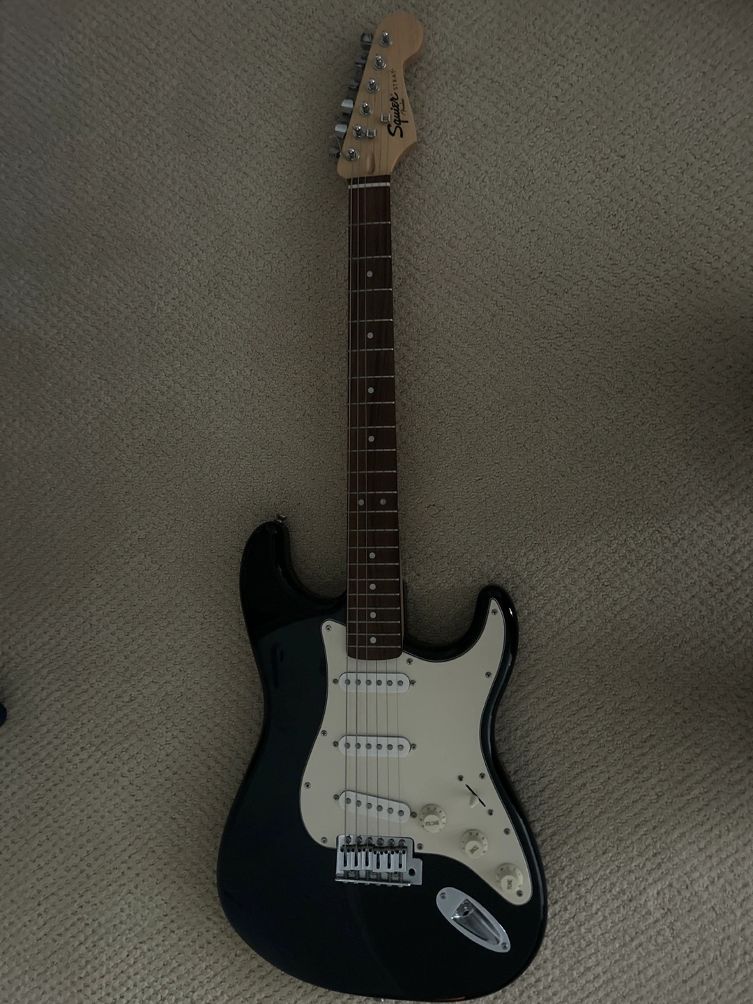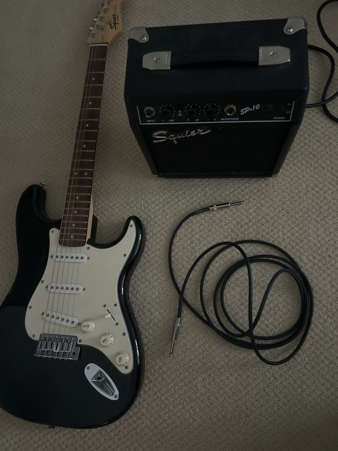 Selling a Squier by Fender Strat electric guitar. The Squier SP-10 amplifier is unfortunately broken but you can feel free to pick it up anyway as it is probably an easy fix. Also included is a blue guitar capo. Great for someone starting out!