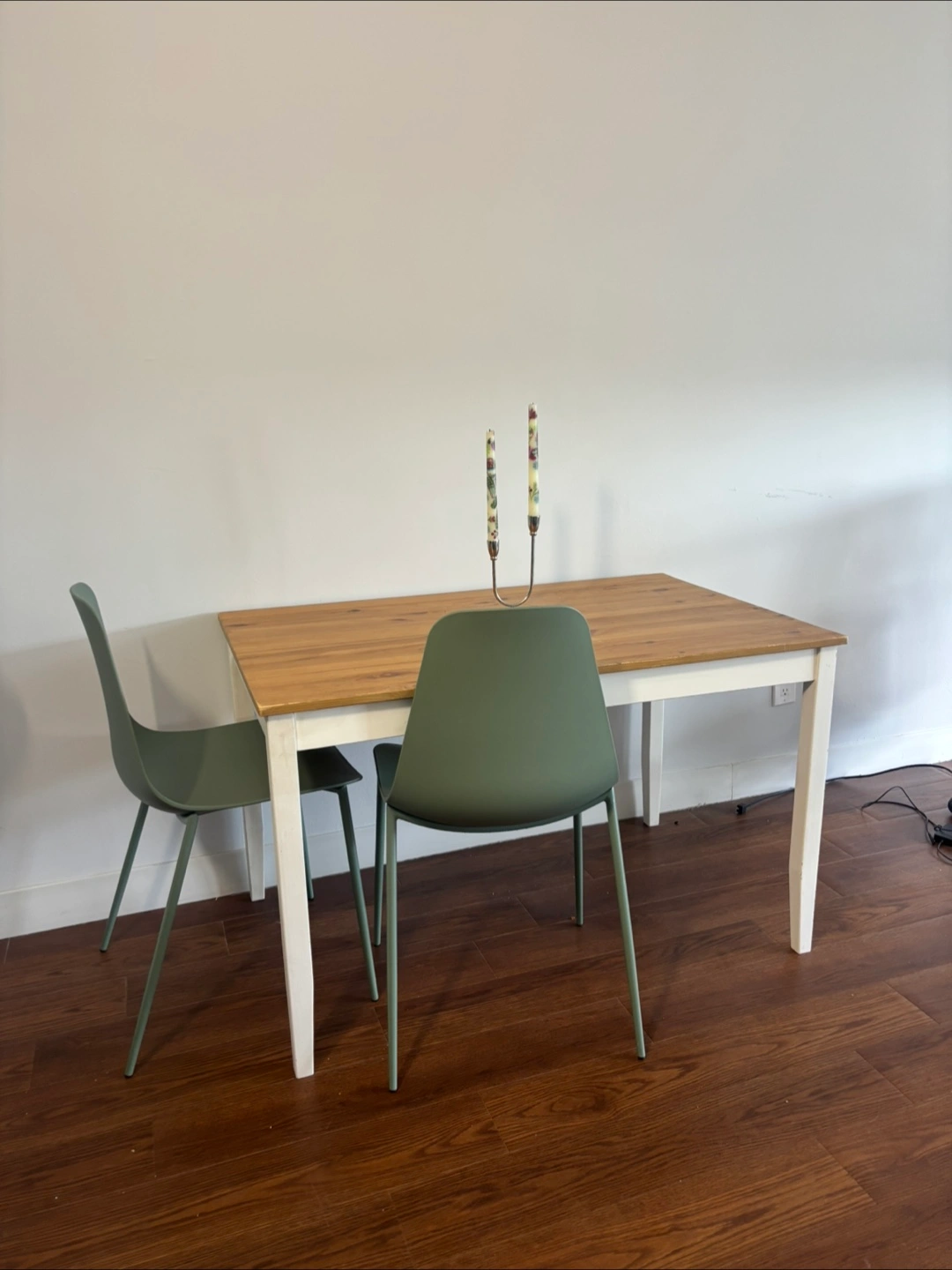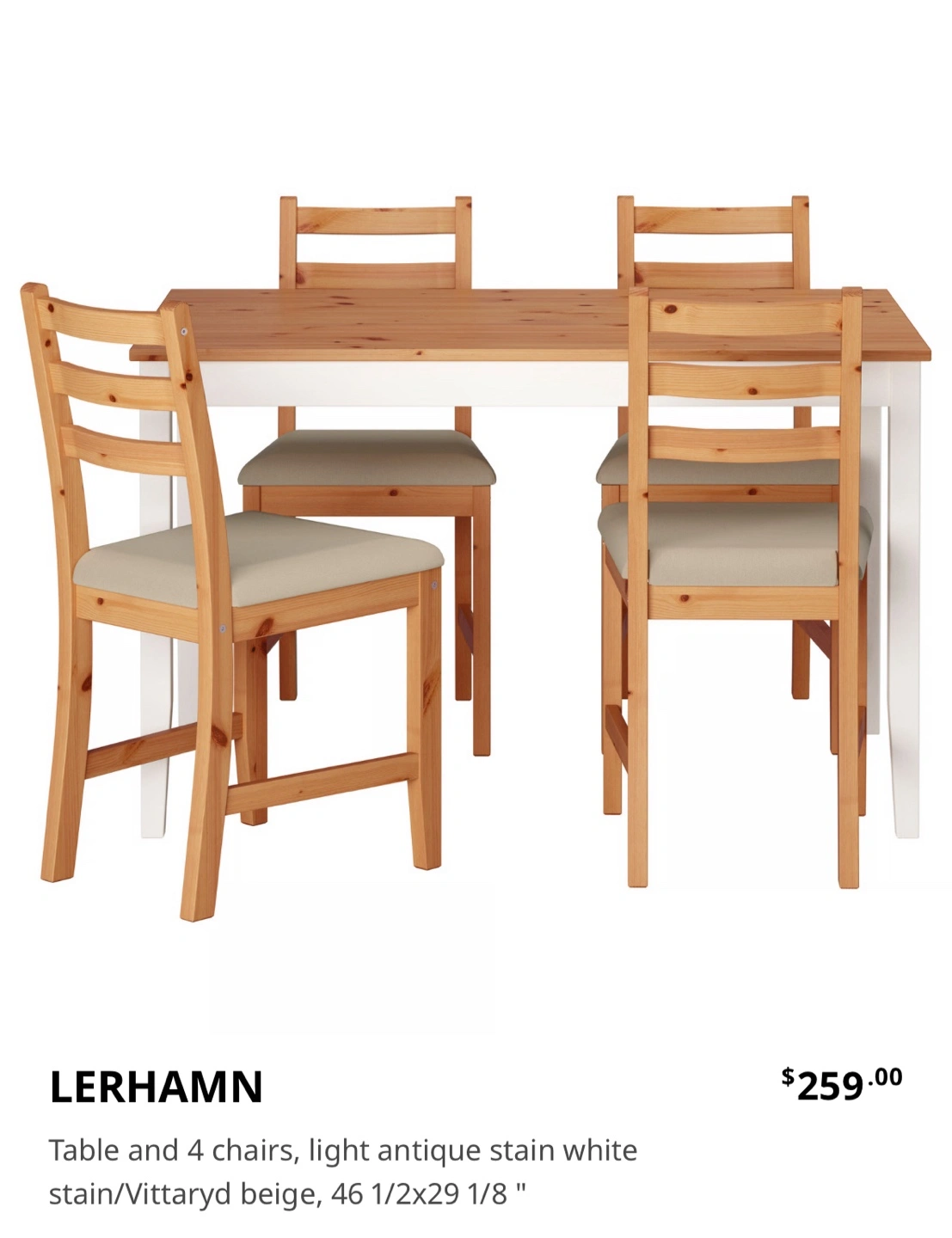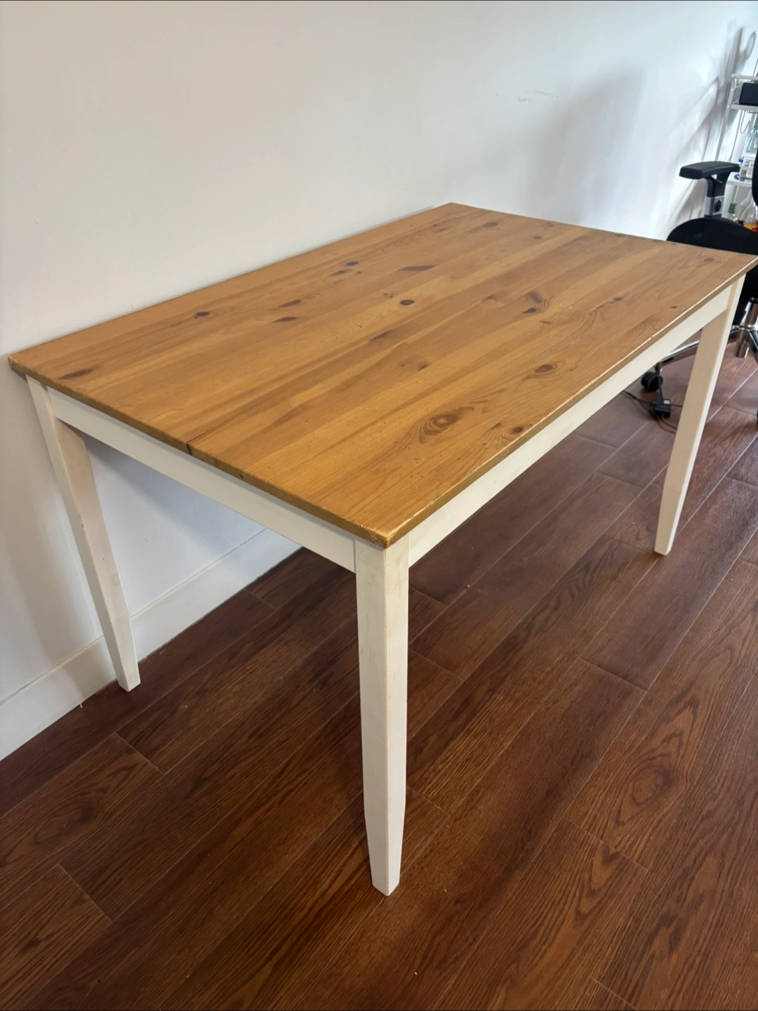 Selling an IKEA Lerhamn table. The table has a light antique stain with white legs. Dimensions are 46 1/2x29 1/8 ". Legs will be removed for transport - super easy to assemble. It’s not in perfect condition but pretty good and no issues structurally.