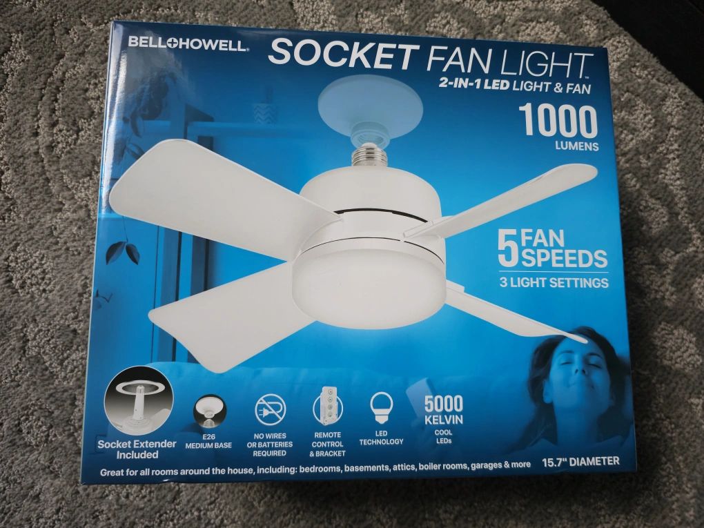 Looking to add some extra air circulation and light to a room? This Bell + Howell Socket Fan Light is a 2-in-1 LED light and fan! It has 5 fan speeds and 3 light settings. It also comes with a remote control and bracket. It's 15.7" in diameter and great for any room in the house!