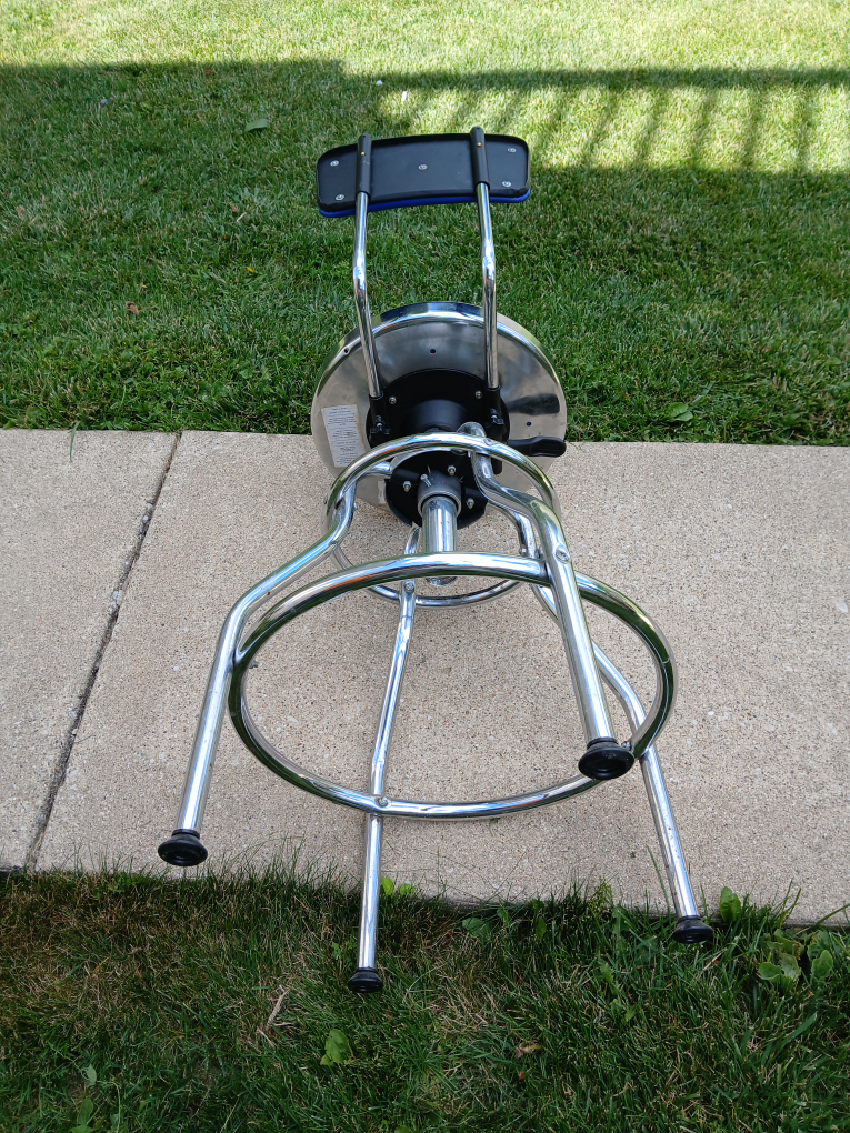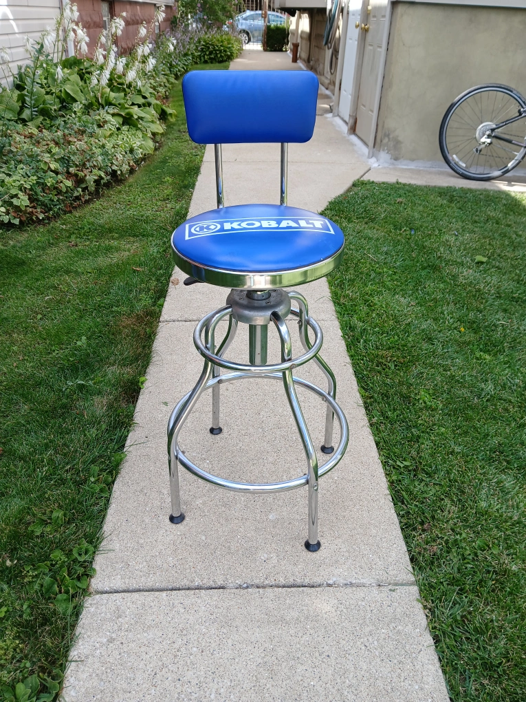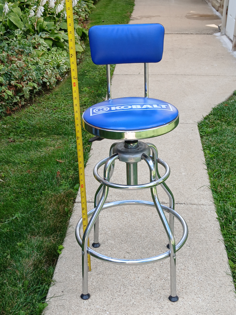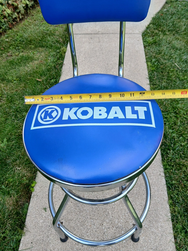 Here's a Kobalt adjustable swivel shop stool! It's blue with a chrome frame. AS IS Hidraulic height adjuster not working. The measurements are 28" high X 13" wide. It's in very good condition. CASH only, no zelle, no Paypal.