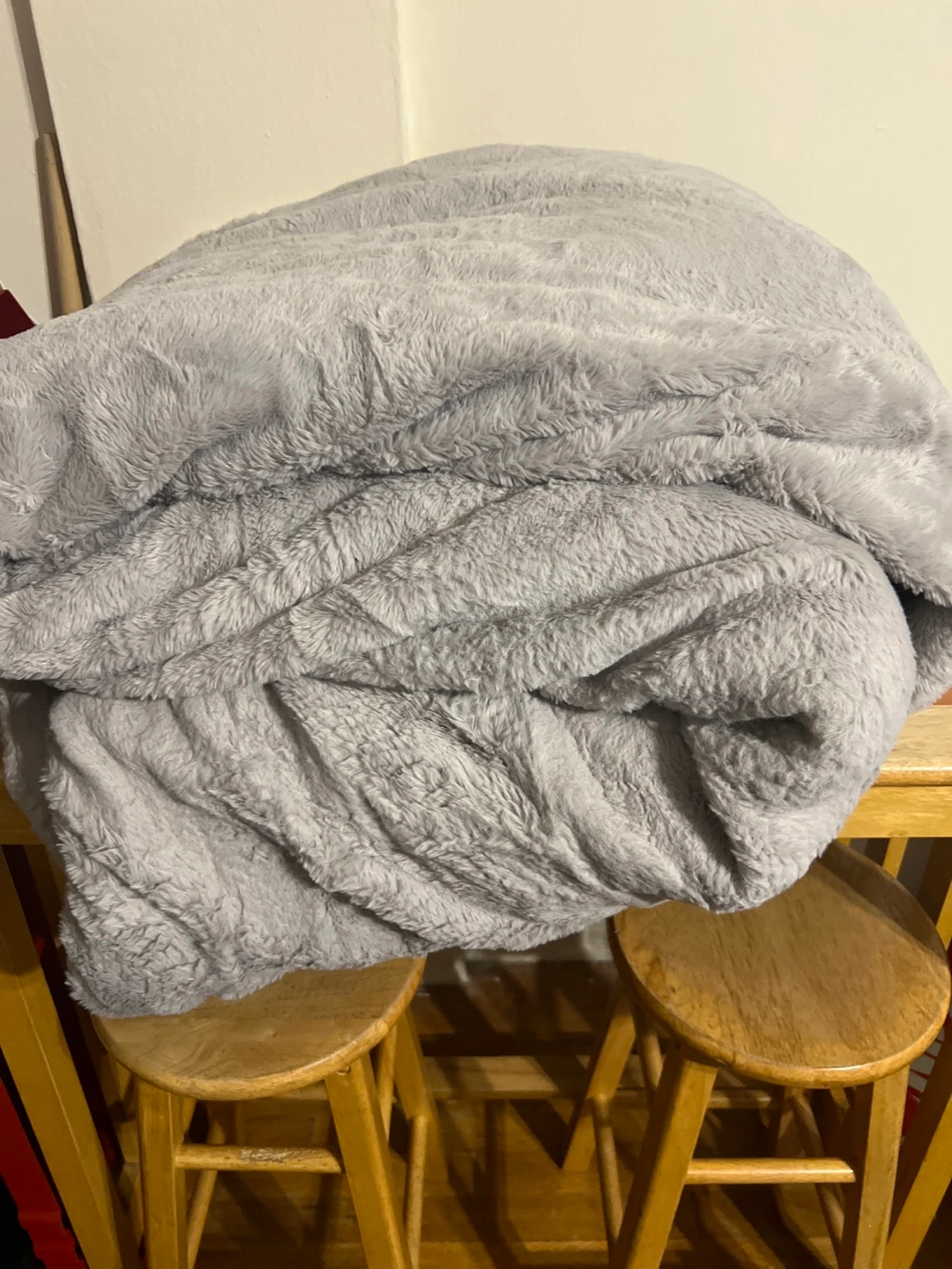 This is a soft, plush blanket in a neutral gray color. It's perfect for snuggling up on the couch or adding an extra layer of warmth to your bed. It's in great condition and ready for a new home Queen
