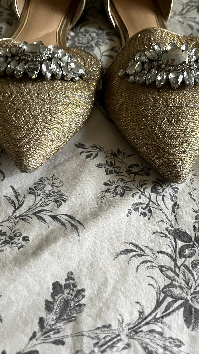 These Jewel Badgley Mischka flats are so pretty! Sparkly gold design with jewel embellishments. Perfect for adding a touch of glam to any outfit!