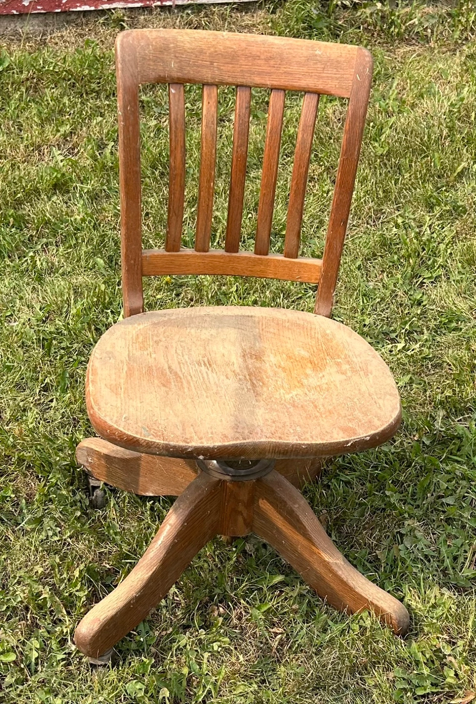 Here's a charming vintage wooden swivel desk chair! It shows some wear and tear from use, but it's still sturdy and functional. Perfect for adding a touch of old-school style to your home office or study. Needs new casters. Swivels smoothly.