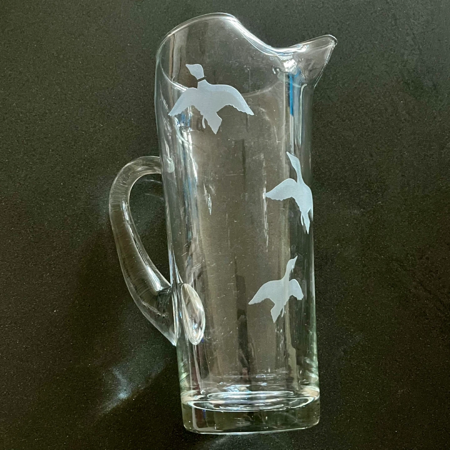This mid-century glass pitcher features a delightful design of etched flying ducks, making it a lovely addition to any home bar or collection. Good vintage condition.