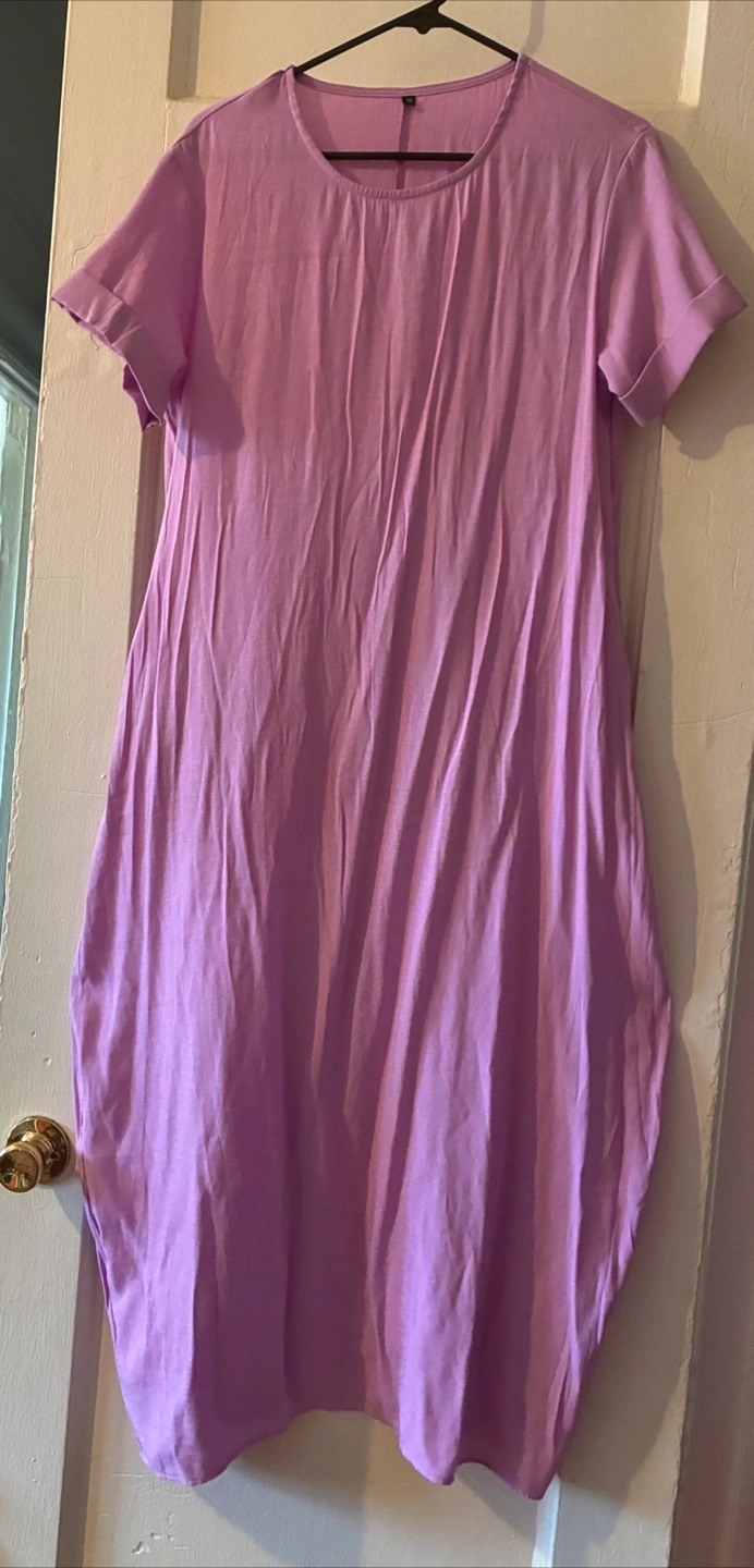 Free! a cute lilac linen like dress! It's a comfortable and stylish piece, perfect for casual outings. The dress is a size M.