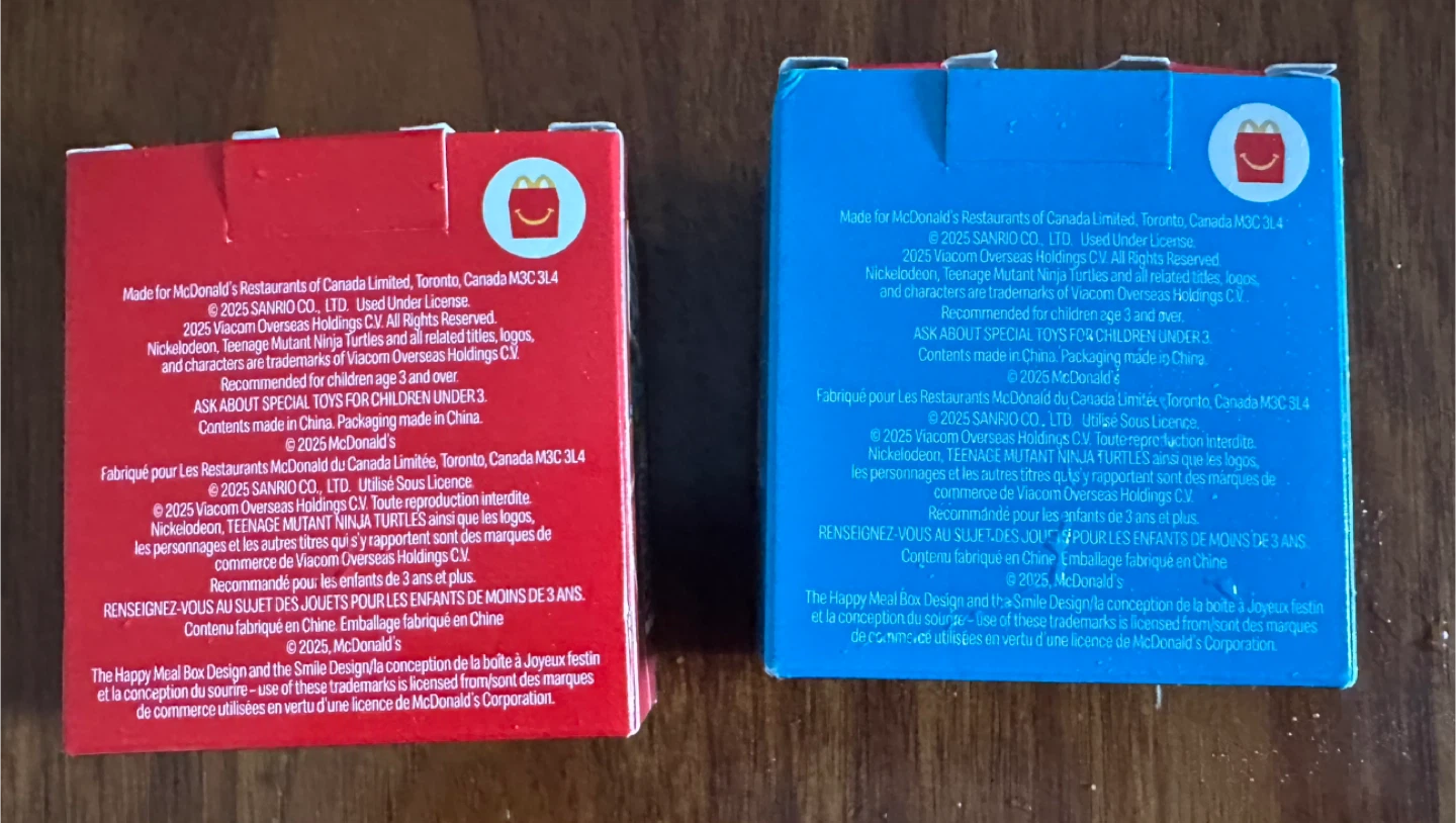I have two McDonald's Happy Meal toys featuring Teenage Mutant Ninja Turtles and Hello Kitty. These are recommended for children ages 3 and over. They come in the original packaging. One is Leonardo and the other is Raphael. $3 each .