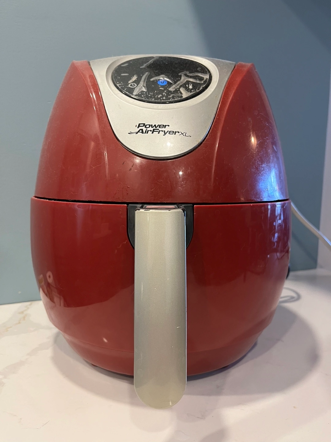 Touch screen protection sticker still on. Still works great. Coating starting to chip, but can use air fryer liners. Cover for button on handle broke off so be careful not to click it by accident.