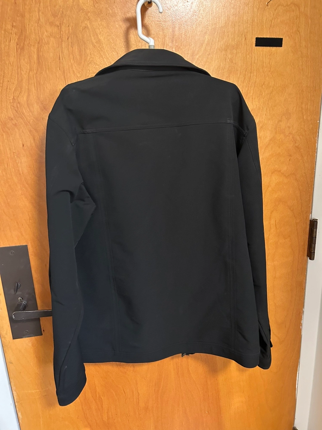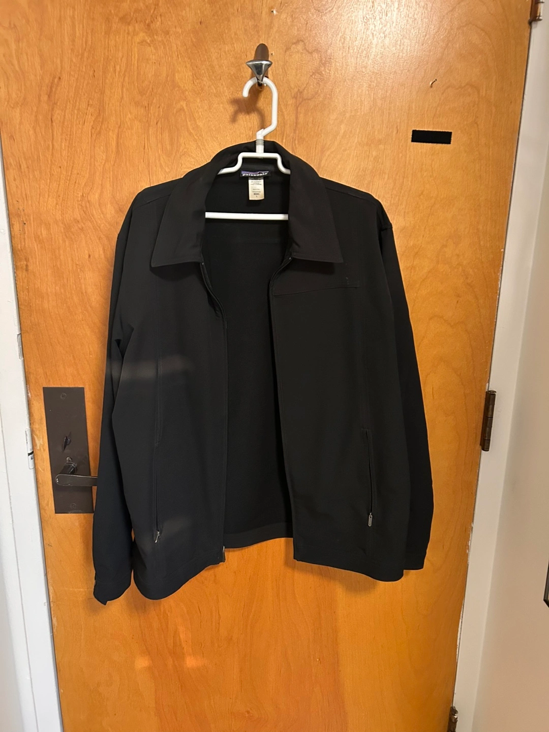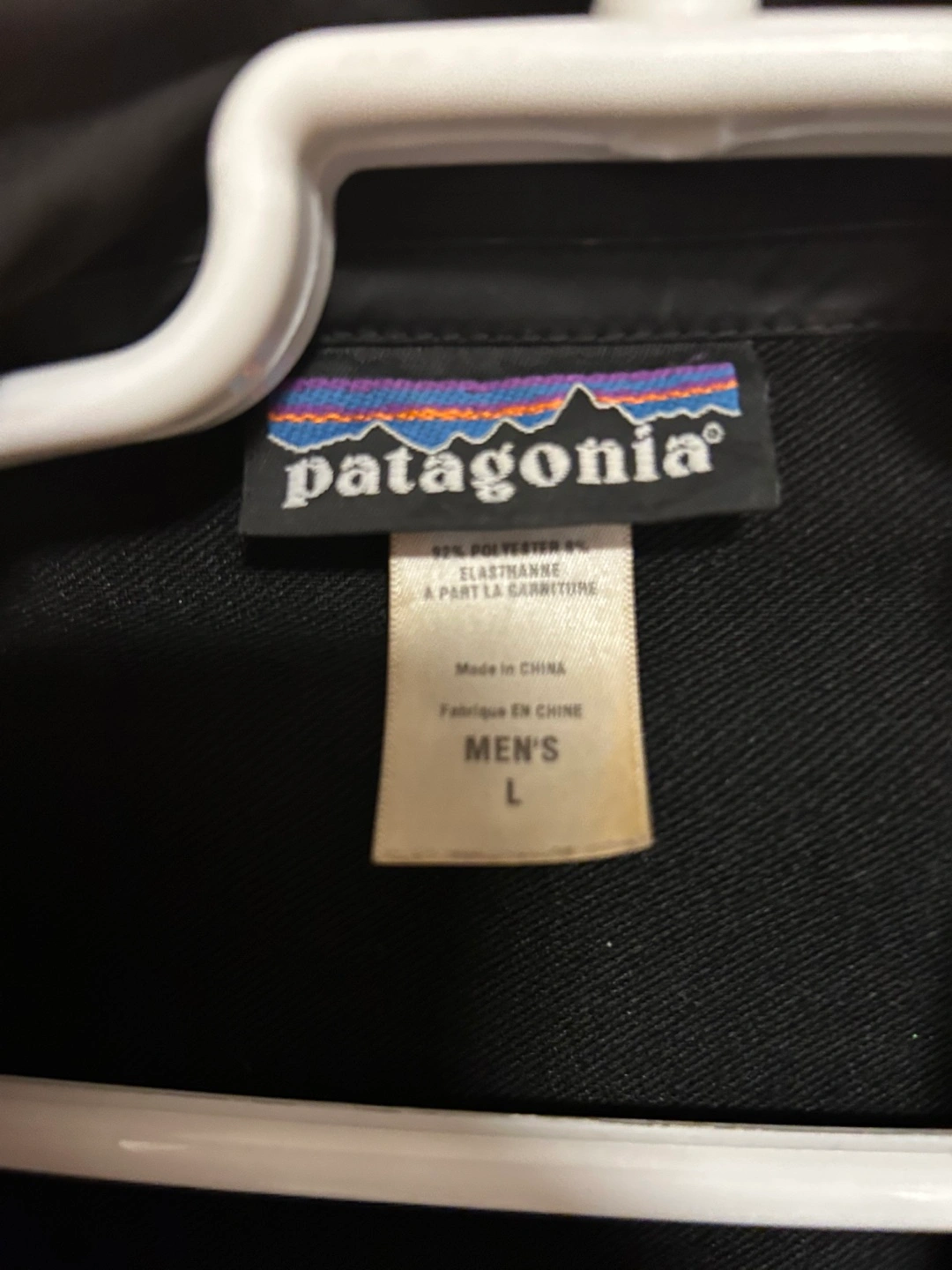 Selling a Patagonia jacket in black, size men's large. It's made of 92% polyester and 8% elastane. Great for layering or wearing on its own!