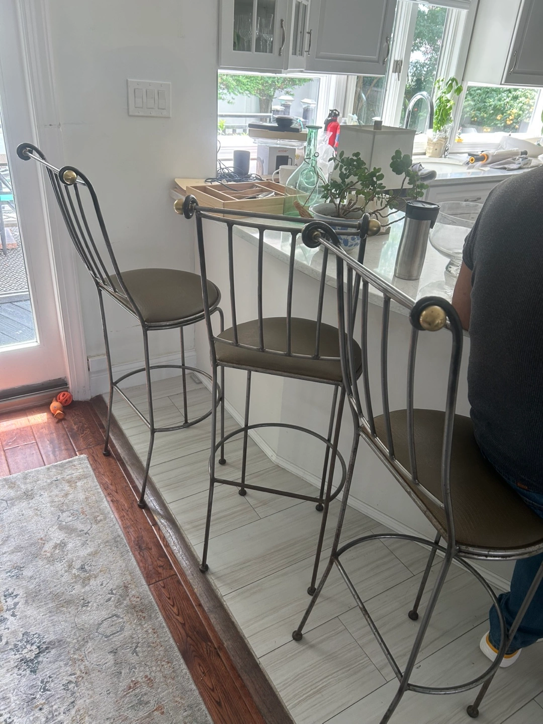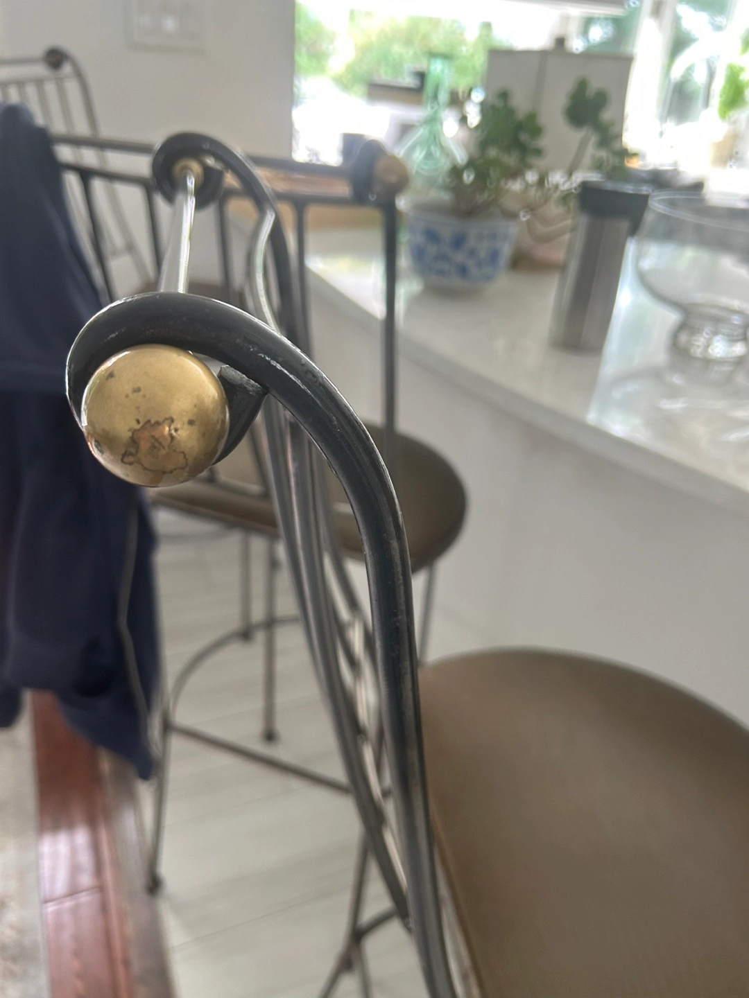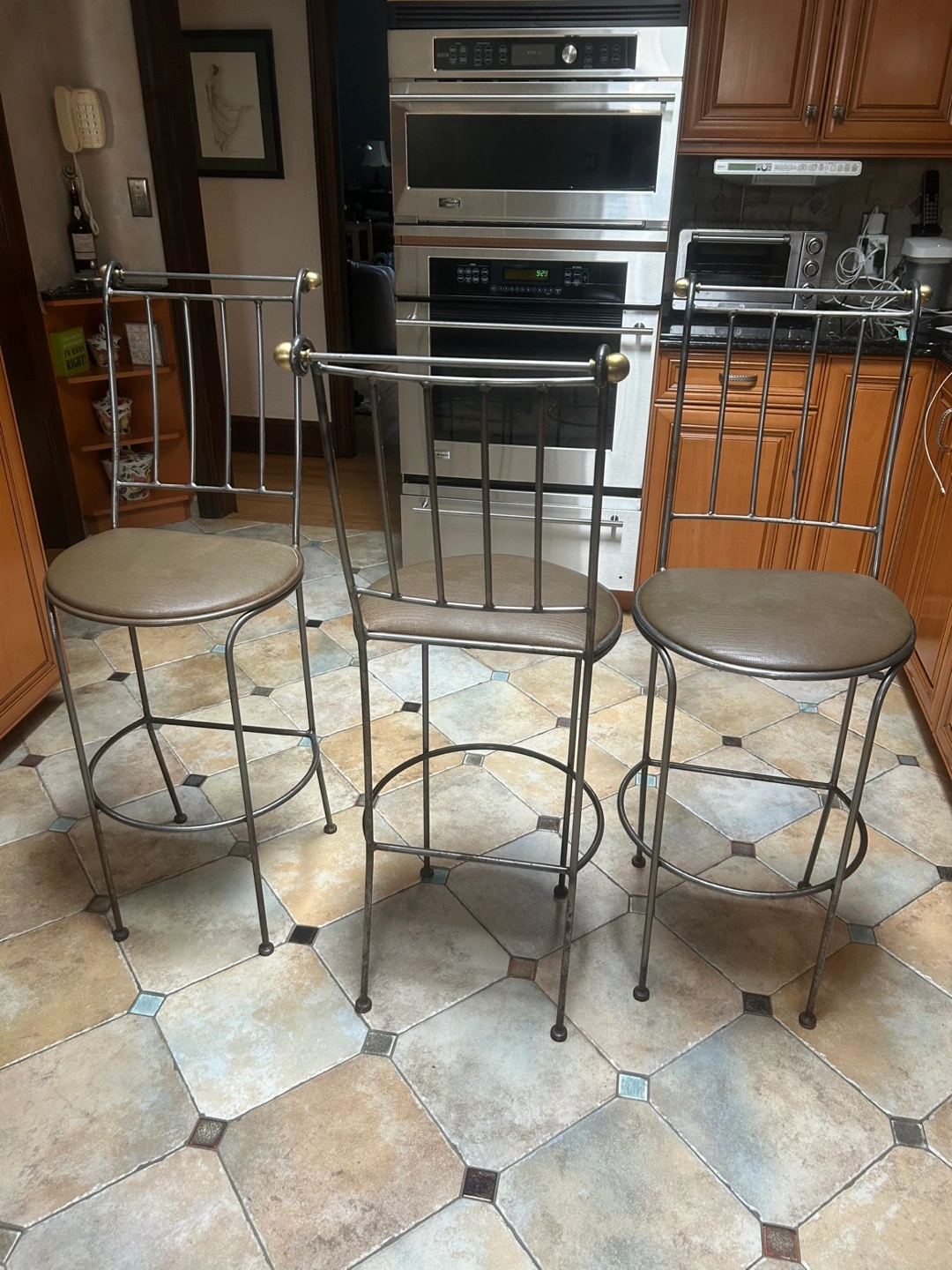Selling a set of three bar stools. They have a two-toned metal frame and a brown padded seat. Great for a kitchen island or bar area! 29” seat