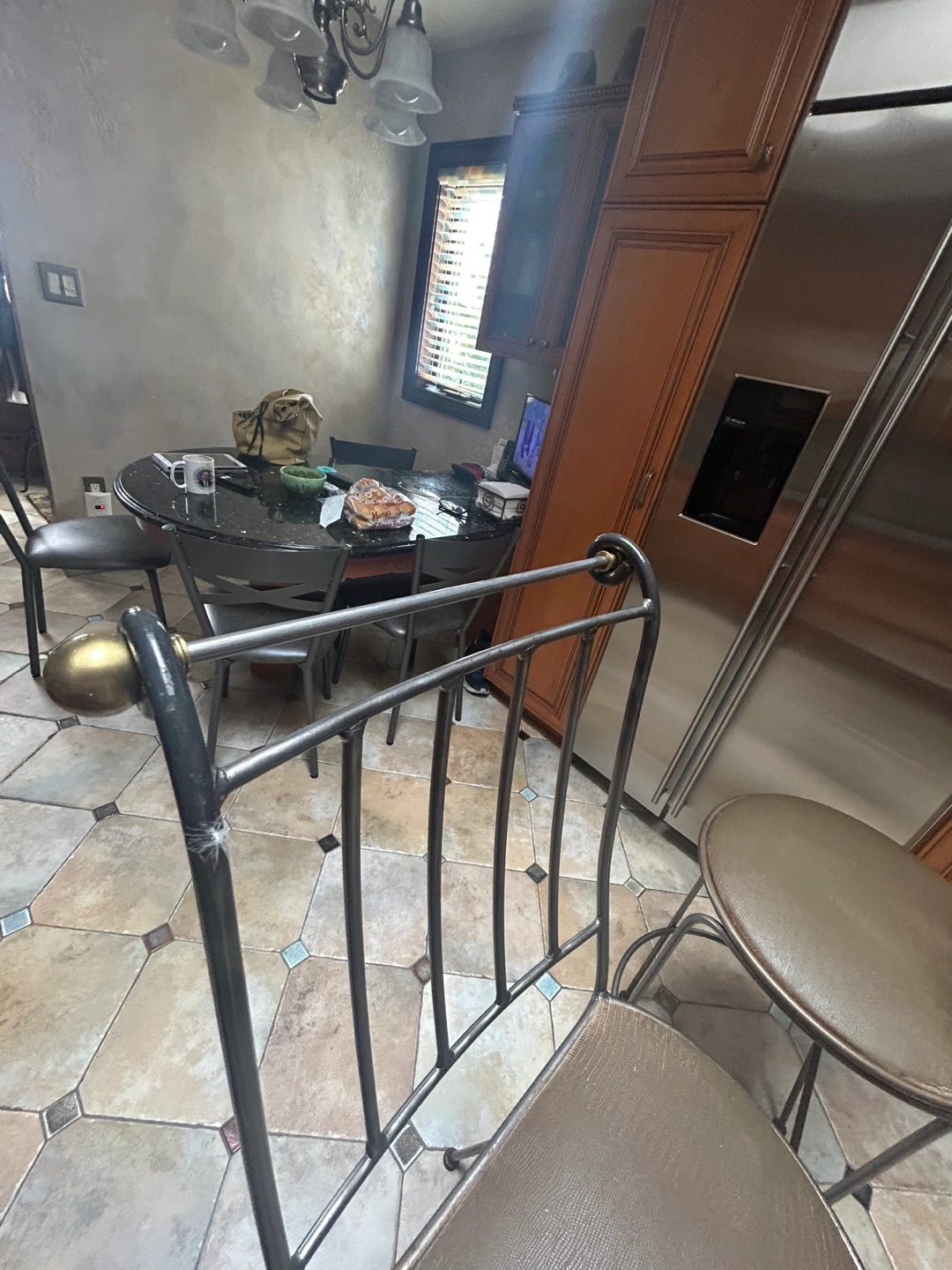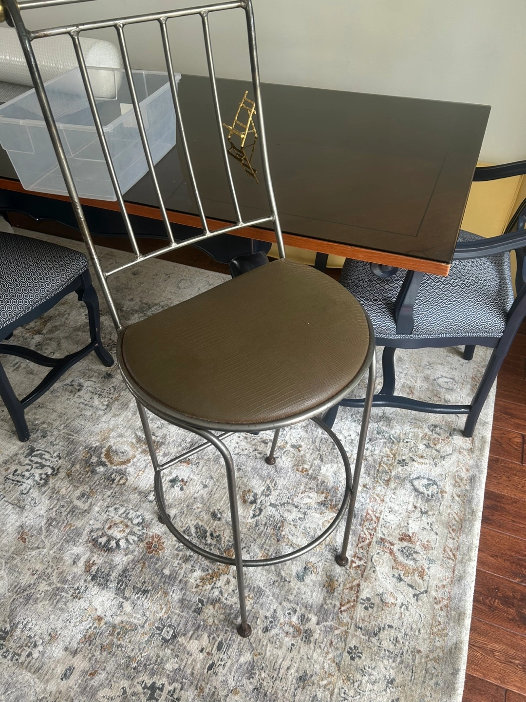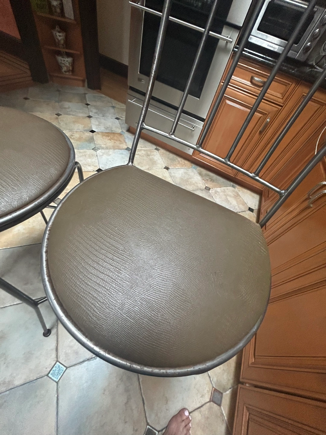 Selling a set of three bar stools. They have a two-toned metal frame and a brown padded seat. Great for a kitchen island or bar area! 29” seat