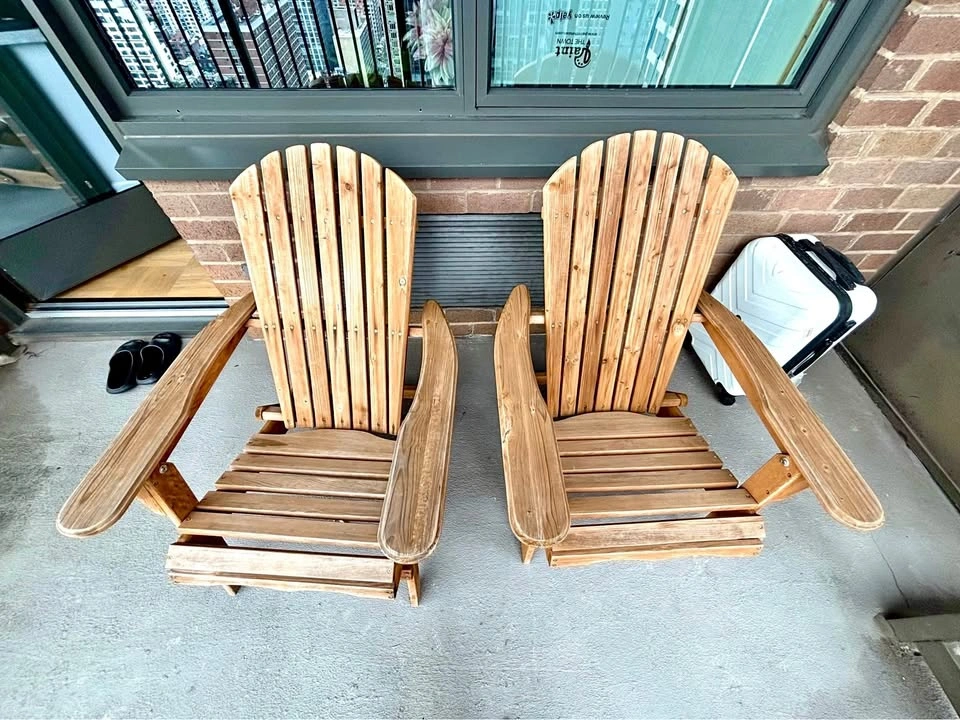 Folding Adirondack chairs, perfect for balcony or patio. Bought recently but selling for move out. Never got to sit on it.