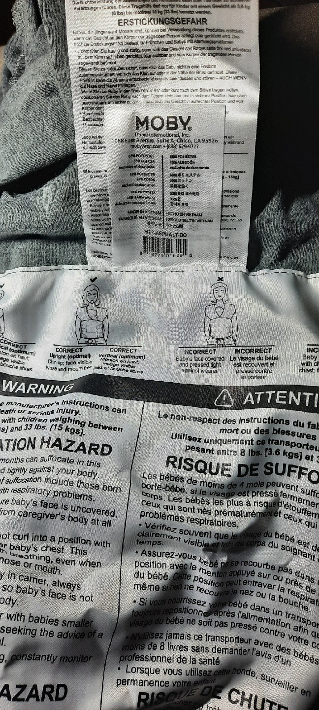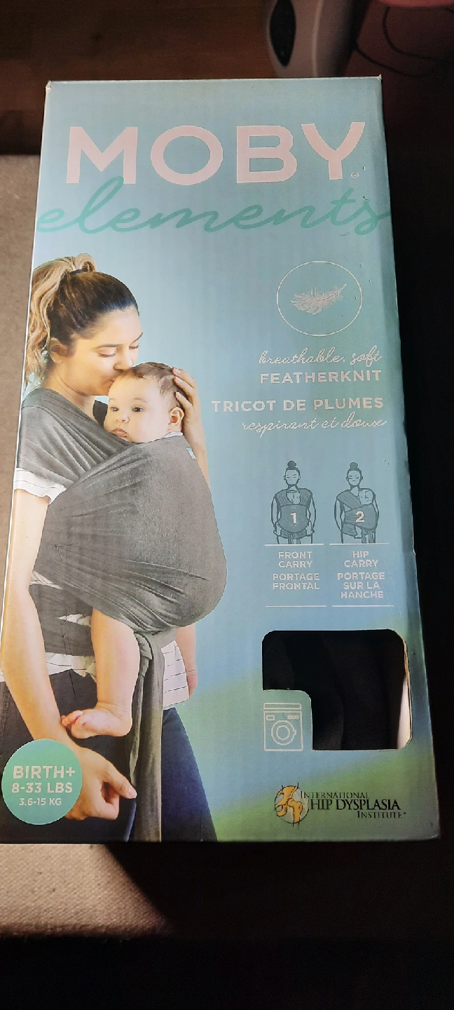 Selling a Moby Elements baby wrap in stone grey! It's made of breathable, soft featherknit fabric. Suitable for babies from birth (8 lbs) up to 33 lbs. The box shows how to use it for front and hip carry. It's in great condition!