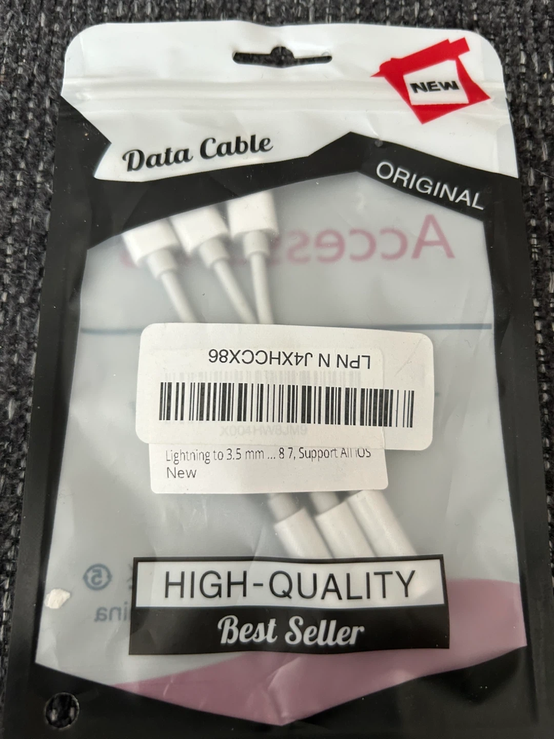 Selling a brand new data cable! It's a Lightning to 3.5mm cable, compatible with all iOS devices. High-quality and a best seller, still in its original packaging