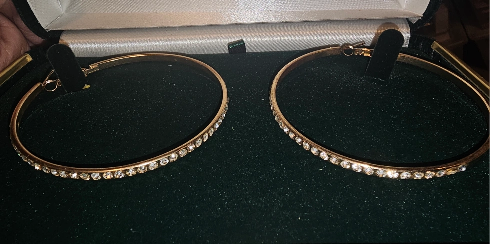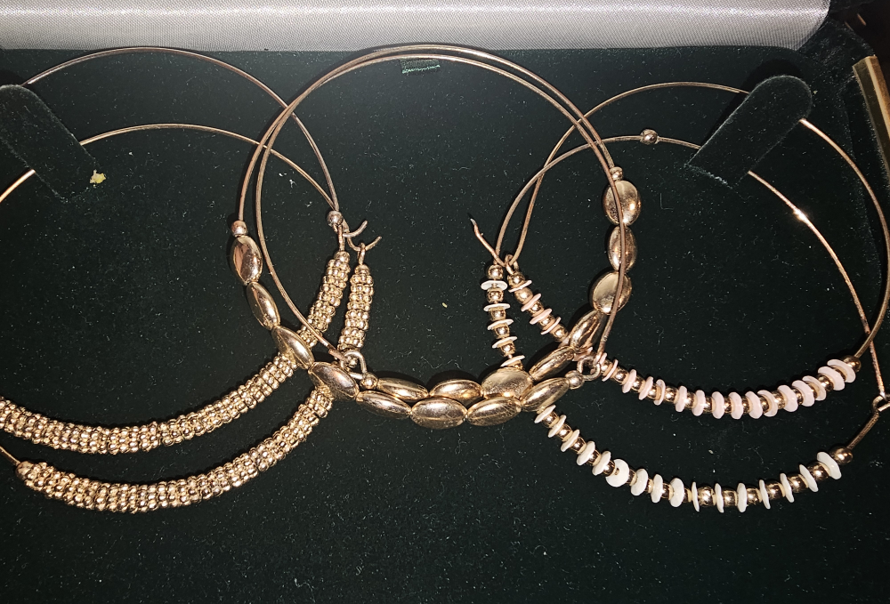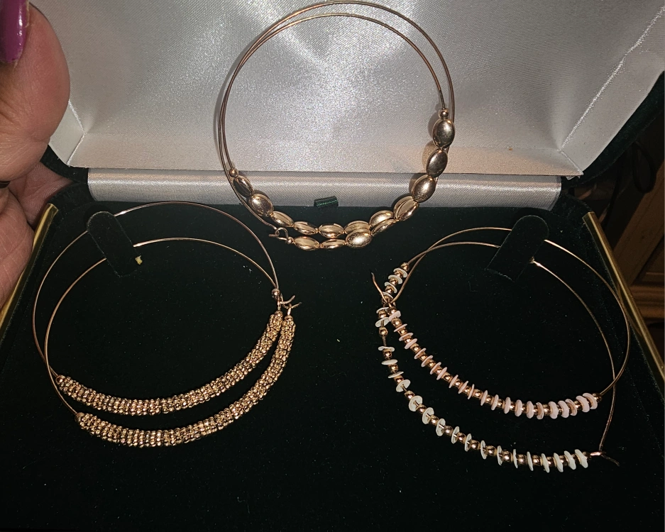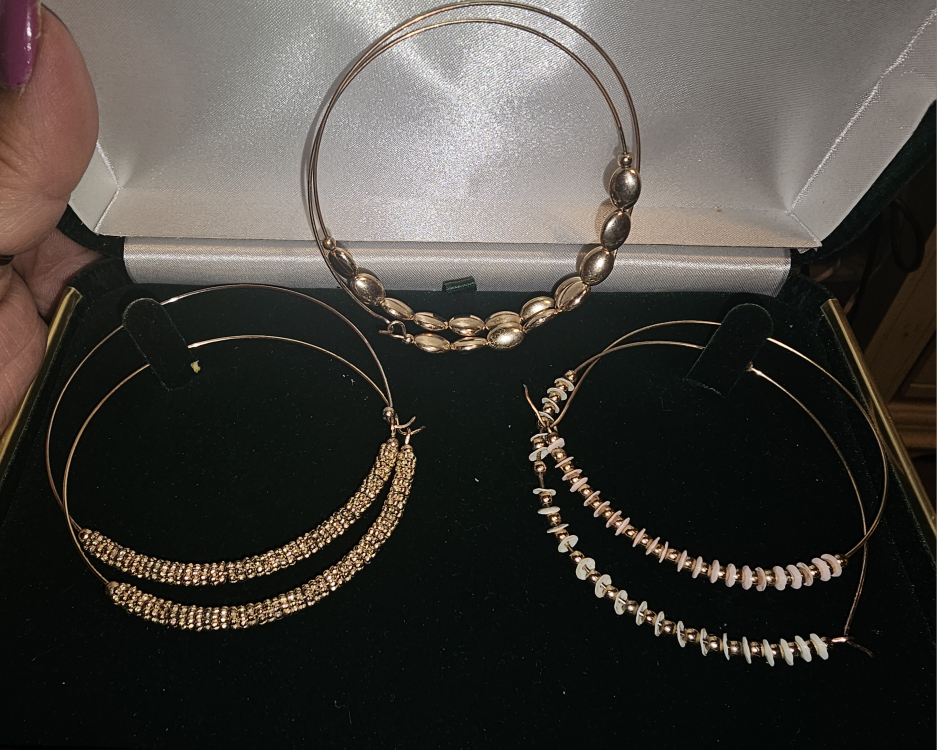 Selling a set of earrings! There's a pair of large hoops with rhinestones, a pair of silver hoops, and two pairs of beaded earrings. Comes in a box for safekeeping