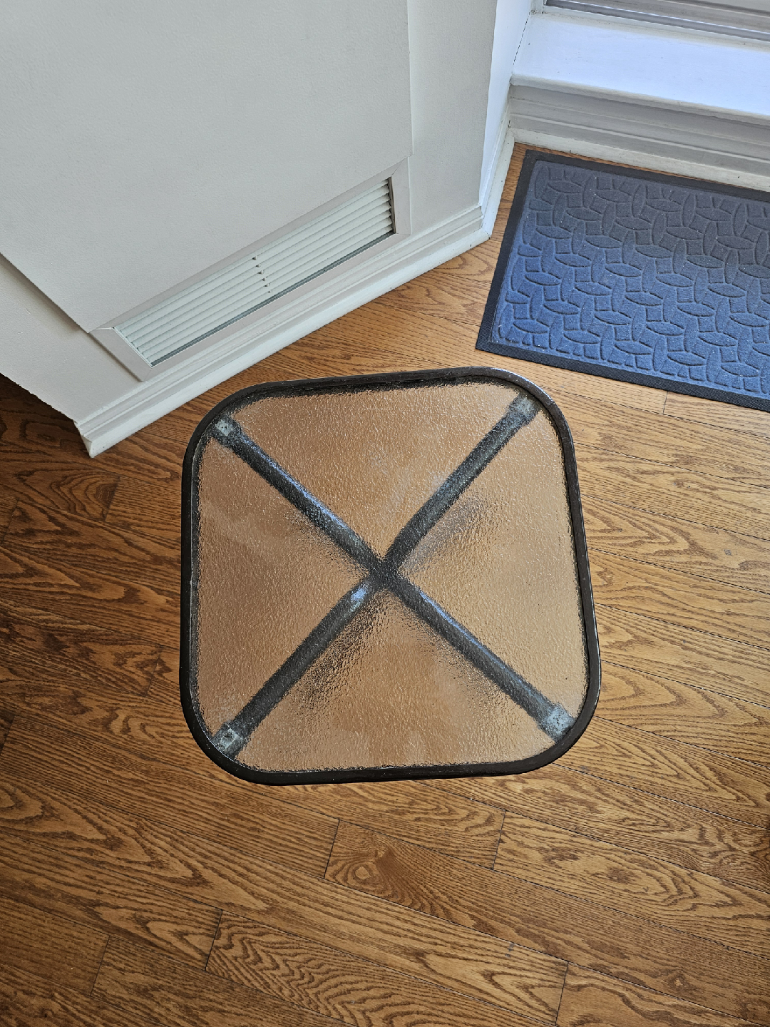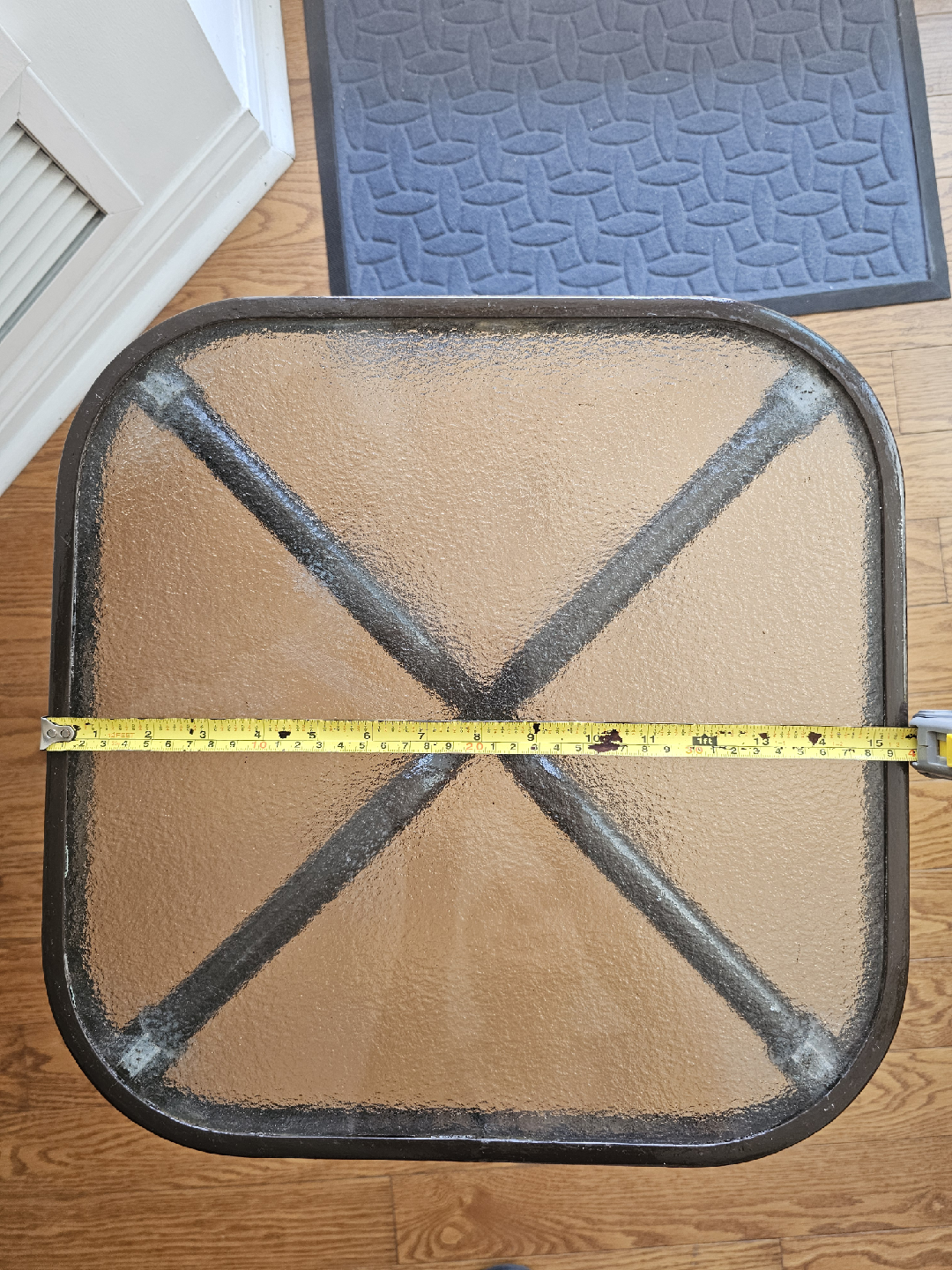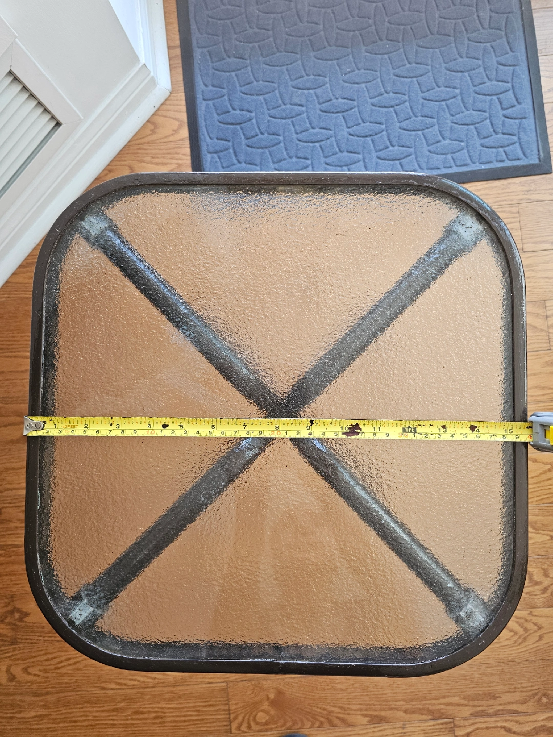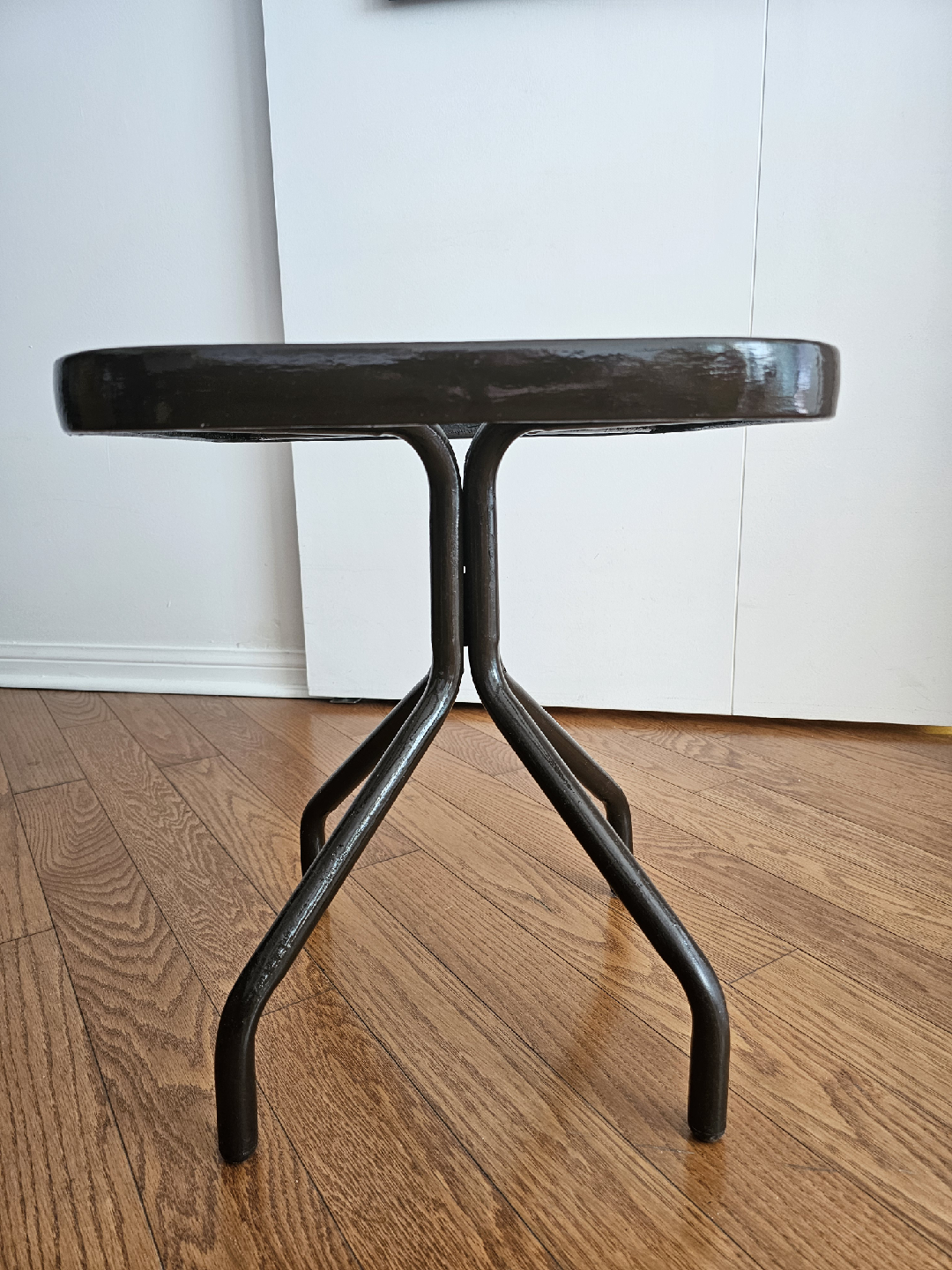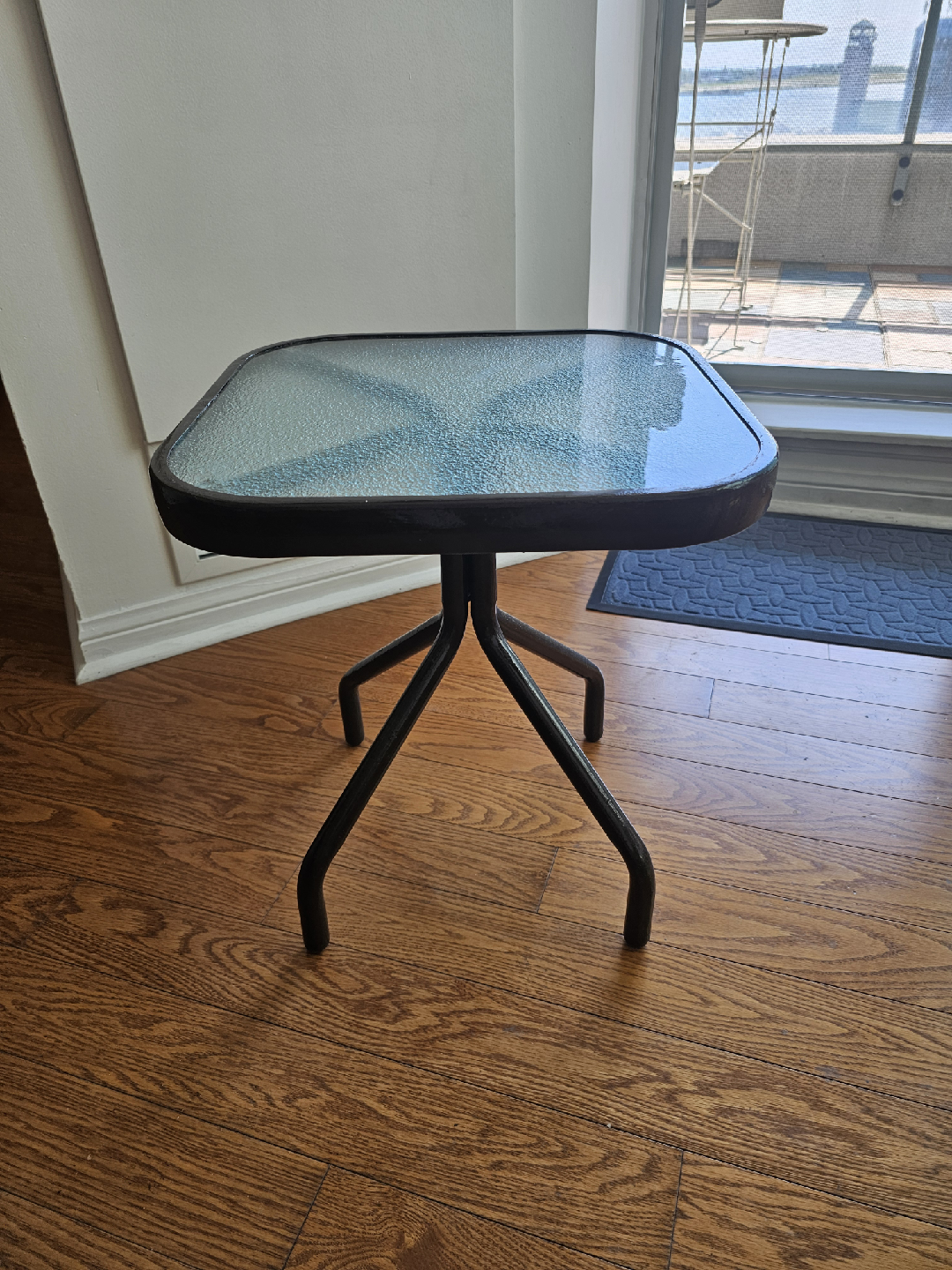 Selling a small side table with a glass top. It has sturdy metal frame, 4 legs, chocolate color. The square top with round corners measures 40cm x 40 cm. Great for small spaces! It was used, but refreshed and looks very nice.
