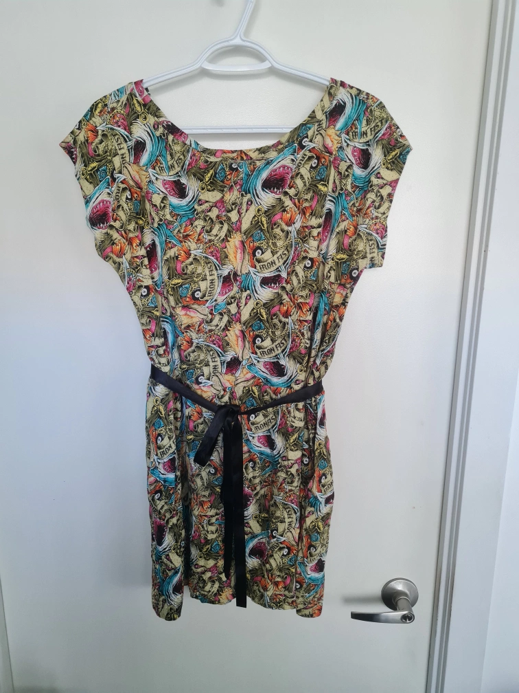 Selling an Iron Fist dress with a unique shark print! It's a size large and comes with a black ribbon belt to cinch the waist. It has 2 pockets, too! Perfect for adding some edgy style to your wardrobe. Only worn once or twice