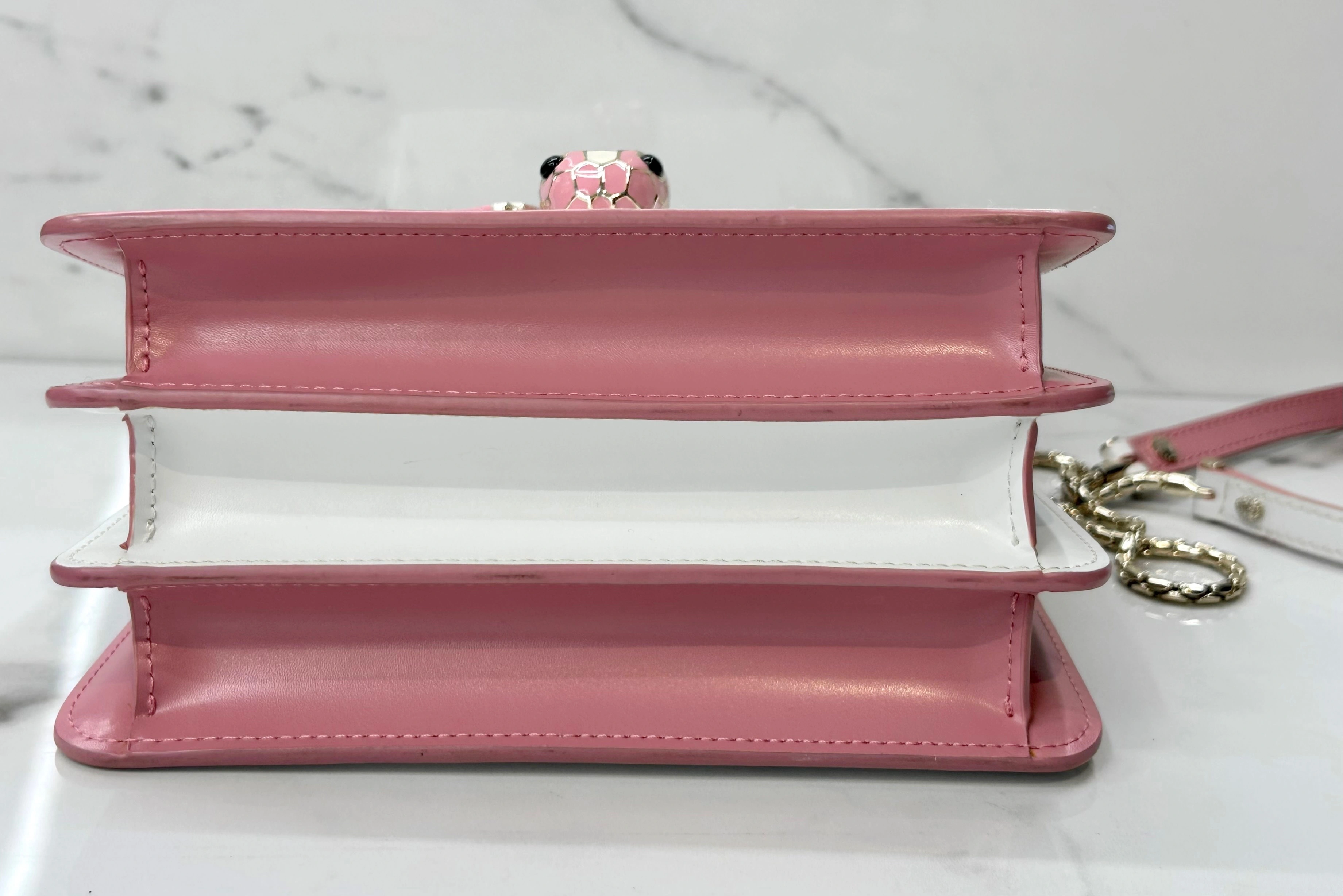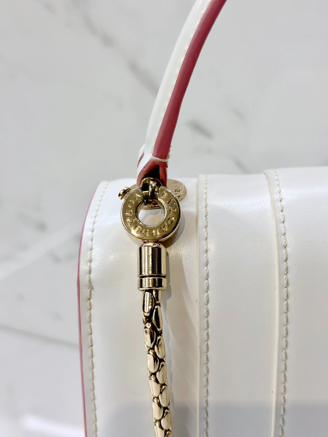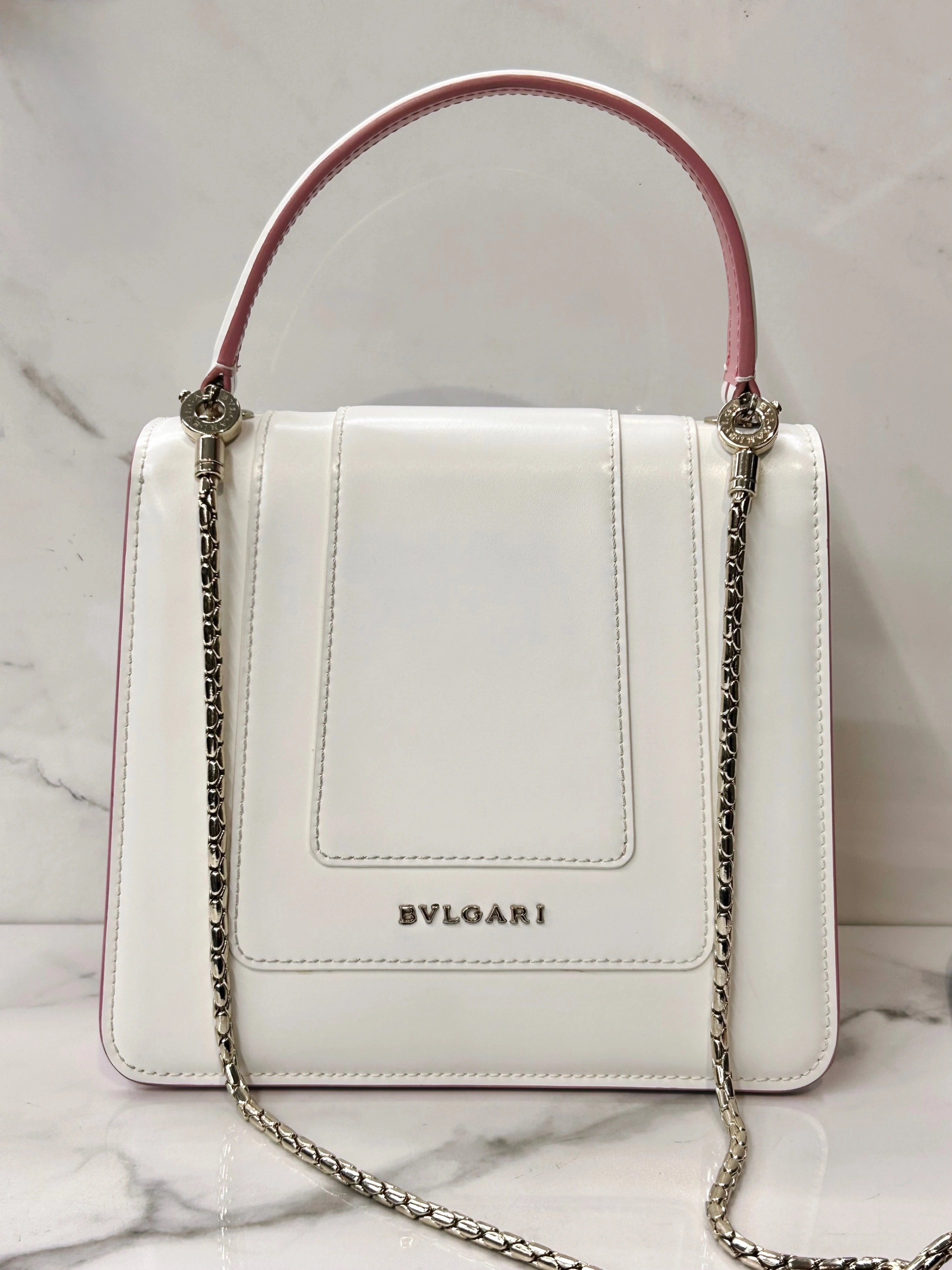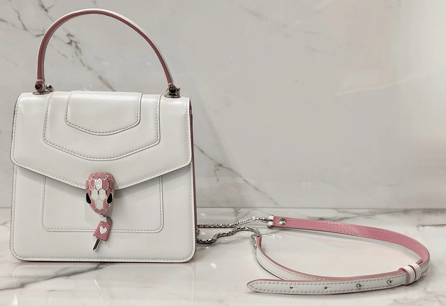 BVLGARI Calfskin Serpenti Forever Top Handle White Pink Comes as seen in photos $3,500 Available at 4 Seasons Pawn Shop & Gold Buyer (Newton Location) 7155 King George Blvd Surrey, BC Canada We are open 9:30 am - 6:00 pm Monday - Saturday and 11:00 am - 6:00 pm on Sundays. For more information visit our shop or give us a call at 604-592-0223 We accept multiple forms of payment including cash, e transfer, debit, visa, Mastercard, American Express, certified bank. We also have an interest free layaway plan available, ask us for more information. Thank you for your interest in our products. #1015338