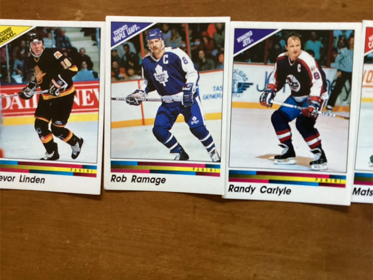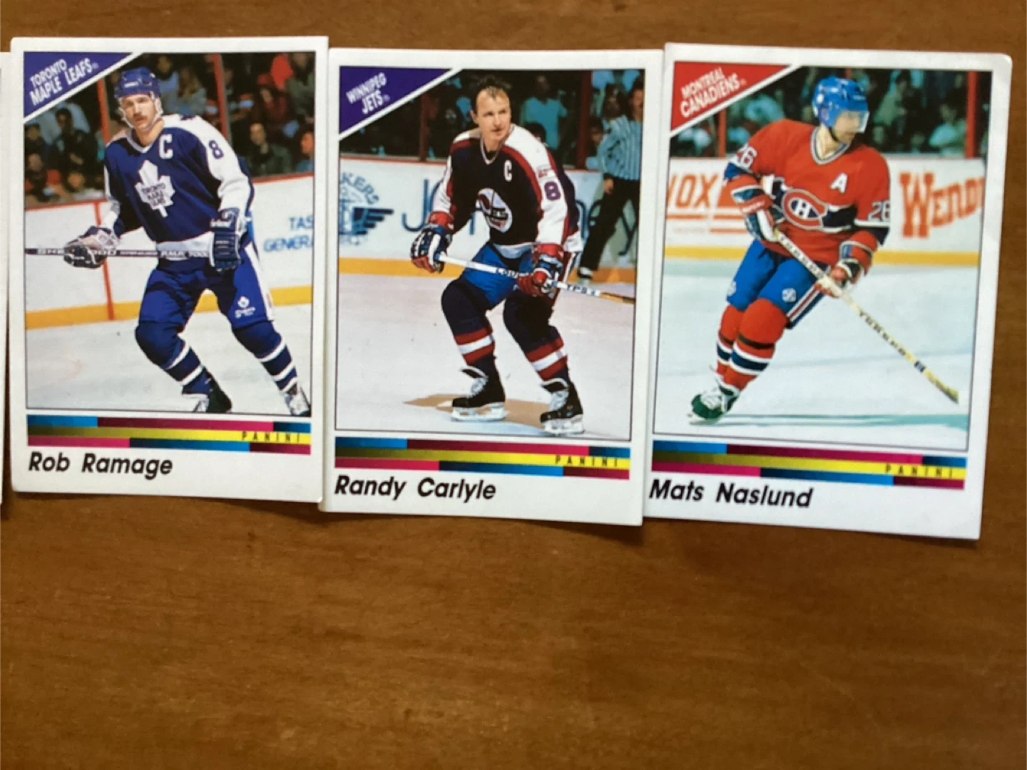 $12.00 for all 5 cards - ROB RAMAGE #280, TREVOR LINDEN #299, LARRY ROBINSON #244, RANDY CARLYLE #314, MATS NASLUND #62 - All clean & in MINT condition - Shipping available - Located at Pape ave & Cosburn ave Toronto - Call Patrick @ 416-930-8338.