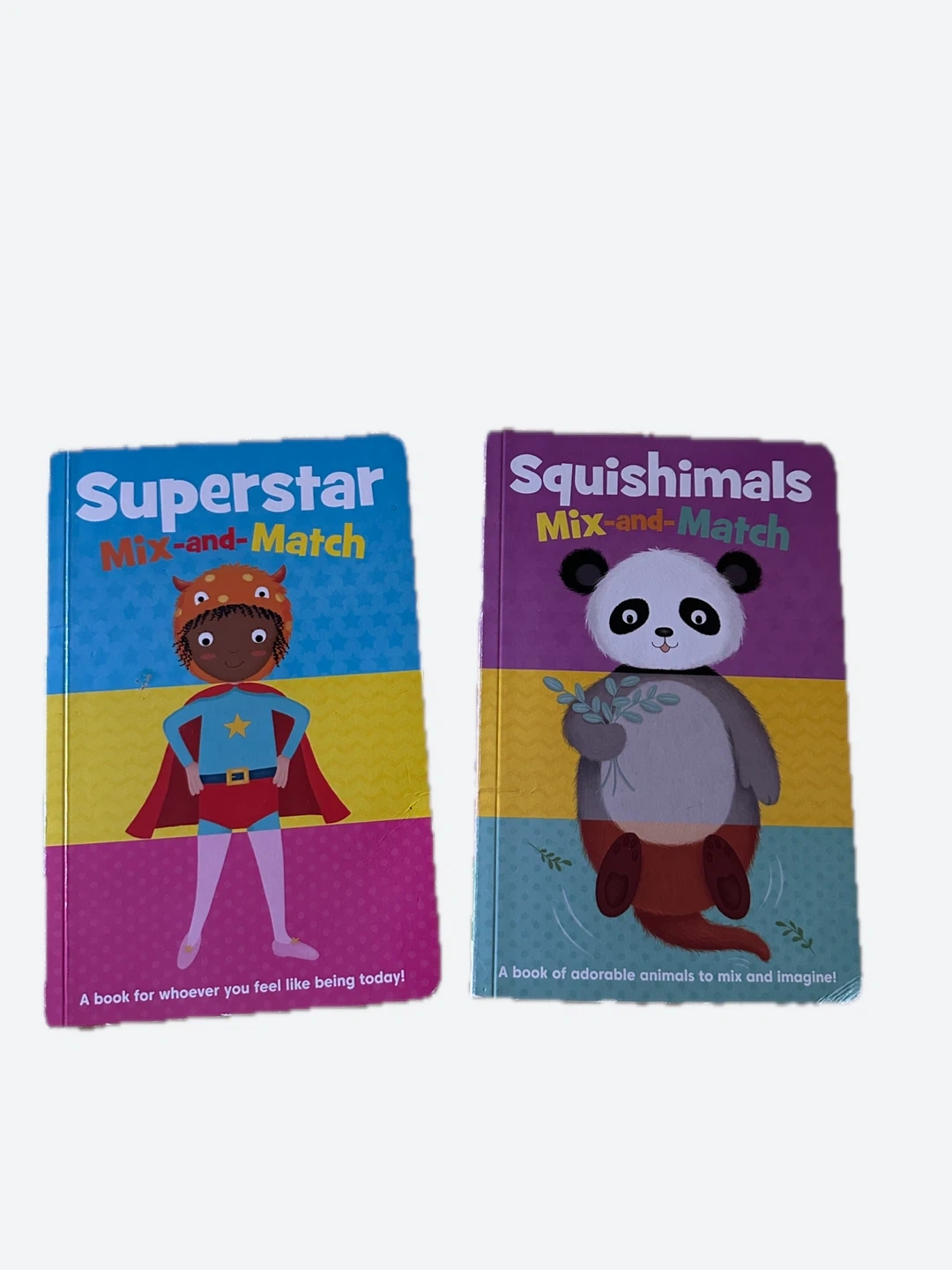 Two cute mix-and-match books for kids! One is titled 'Superstar' and the other is 'Squishimals'. Great for little ones to mix and imagine!