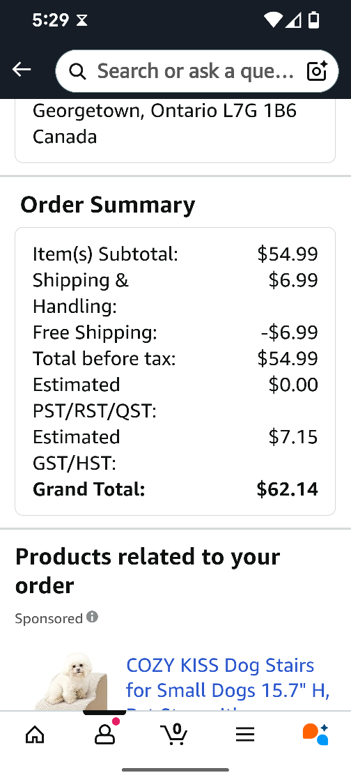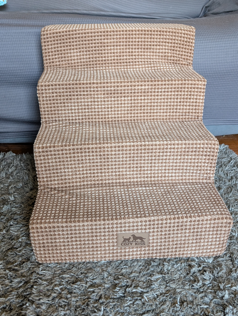 Cozy Kiss small dog/cat stairs, bought off amazon on Aug 15 but cat refused to use them. Firm foam, removable cover, convenient carrying handle, non-slip bottom. 17.7 inches tall, 23.6 inches long, 17.7 inches wide. Paid $62.14, asking $50 to save me from having to try and suction all the air out to return.