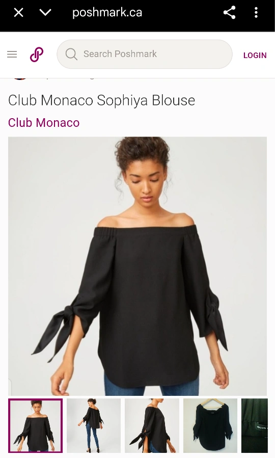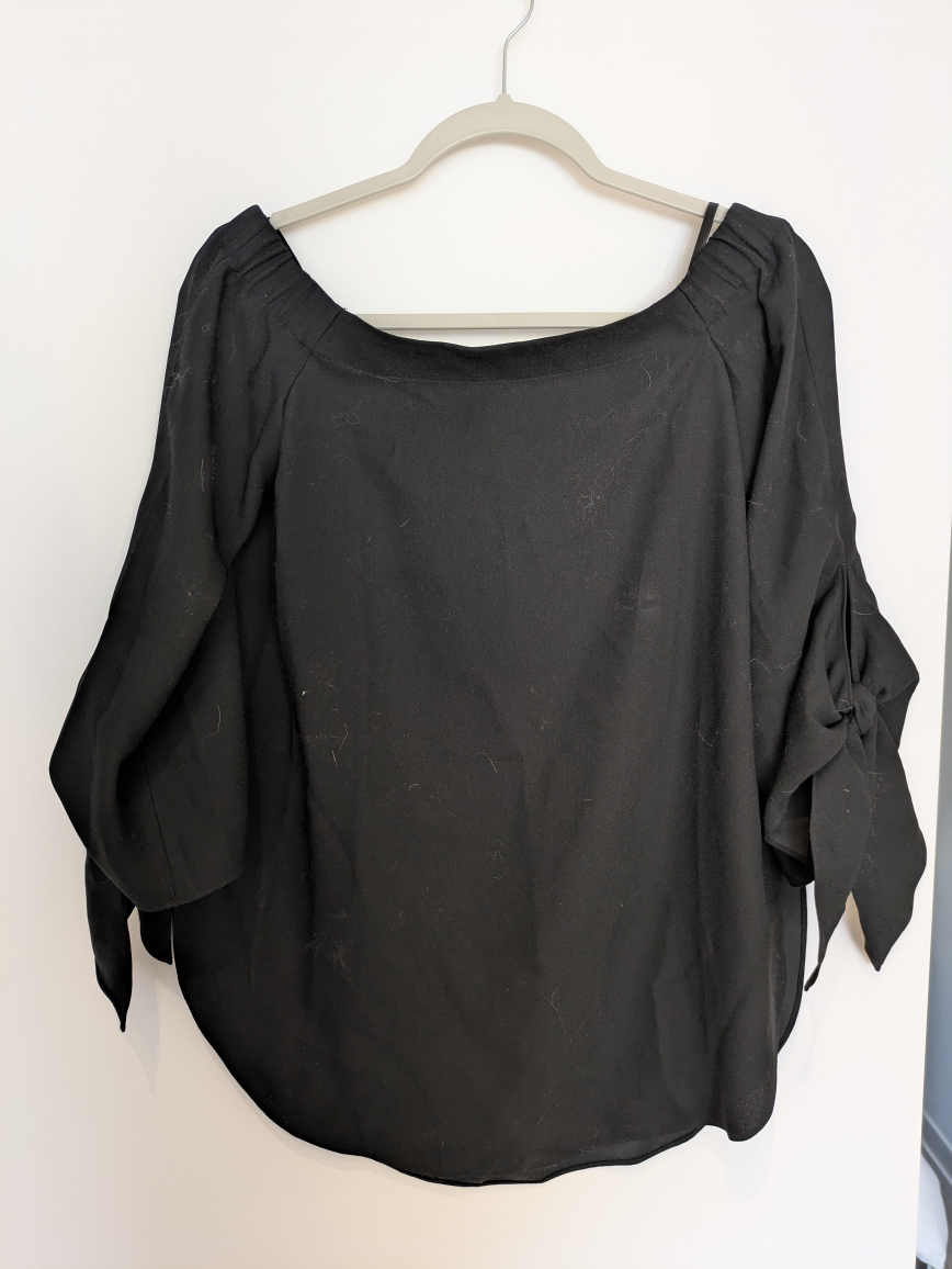 Selling a Club Monaco Sophiya blouse in size 00. It's a stylish off-the-shoulder top with tie details on the sleeves. Great for a night out or a casual day!