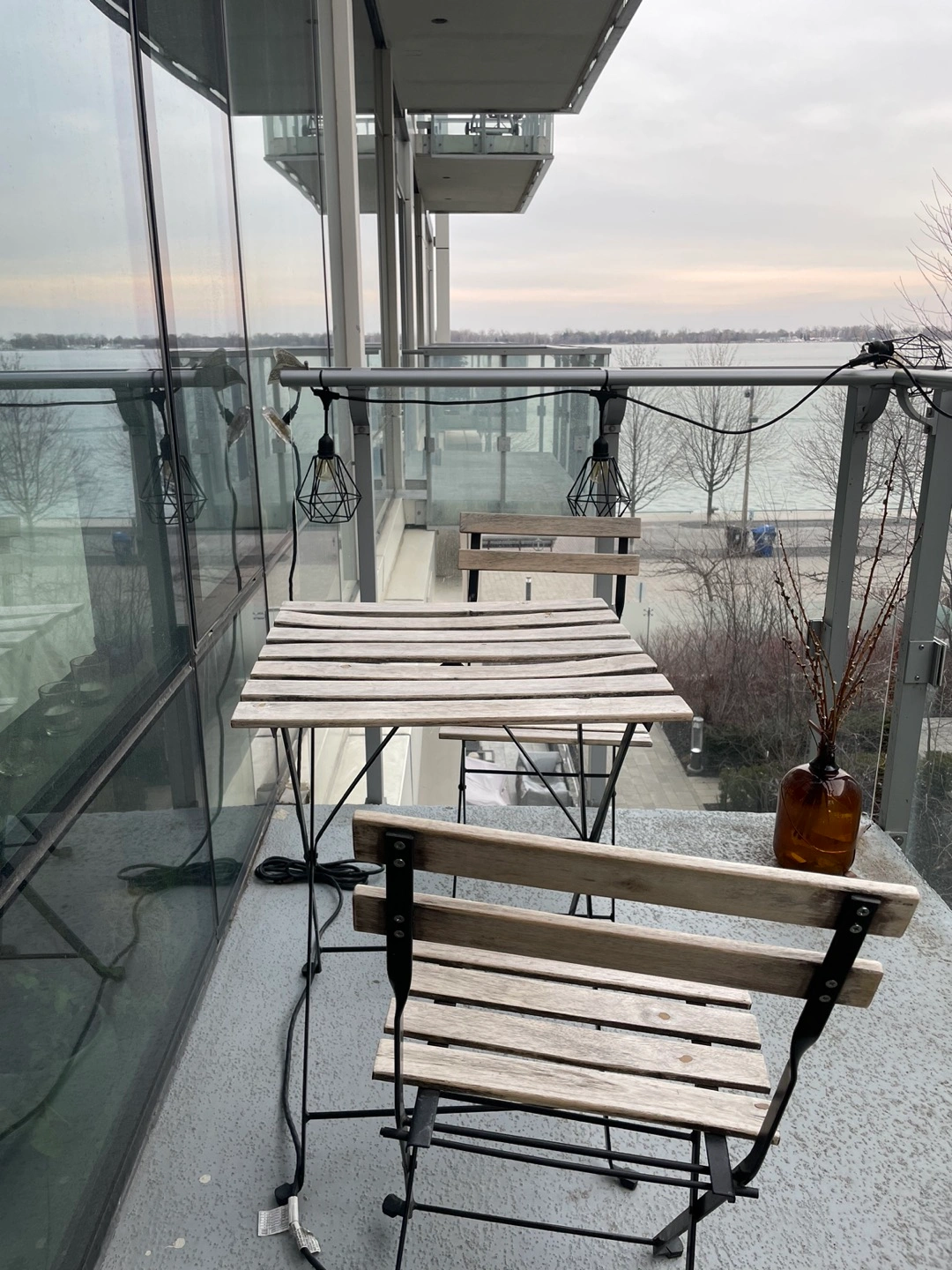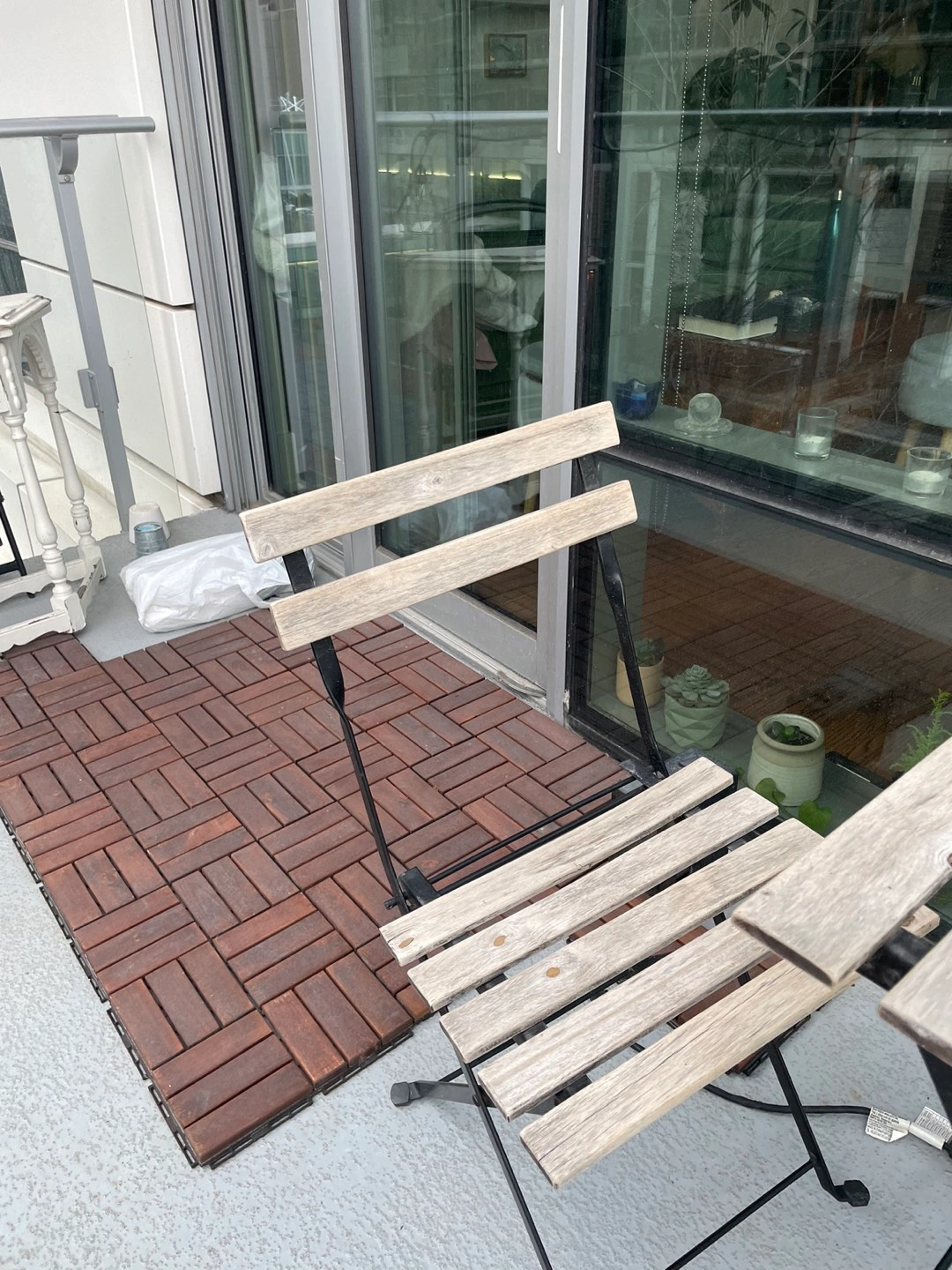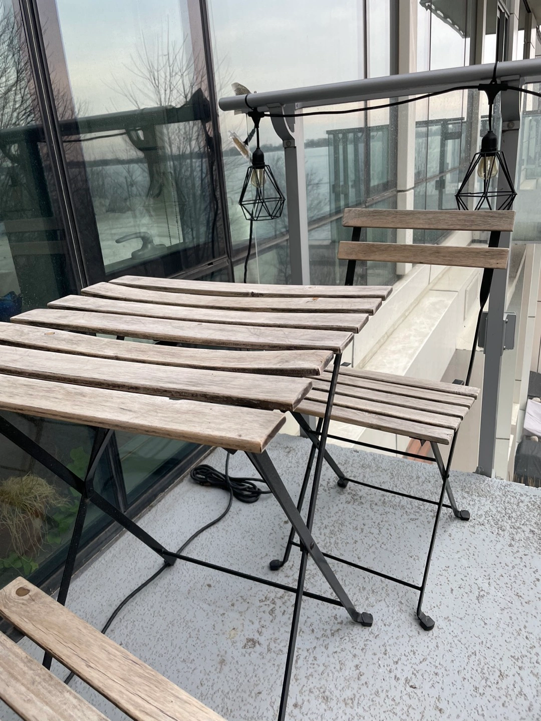 Ikea patio furniture. Comes with cushions, 2 chairs, and a table. Weather proofed and sanded for the season.