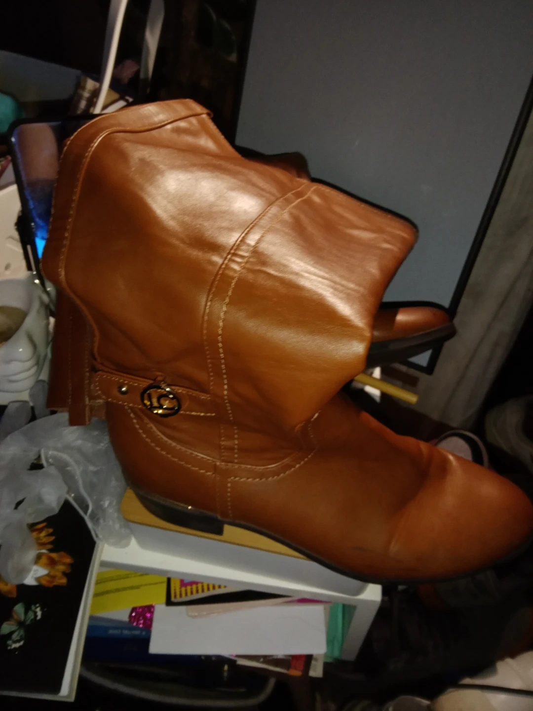 These brown leather boots are from Liz Claiborne. They're a size 9M. The boots have a decorative buckle on the side. They're made of a smooth leather material.