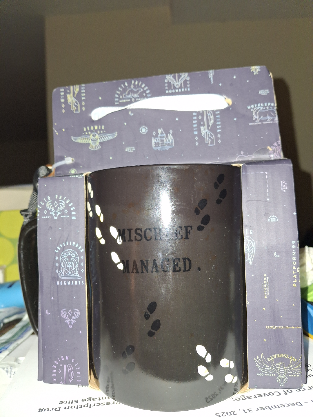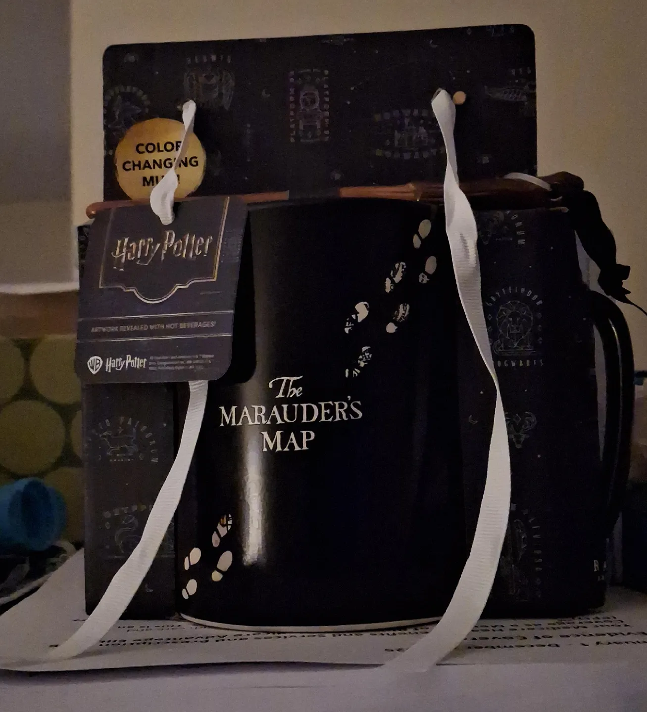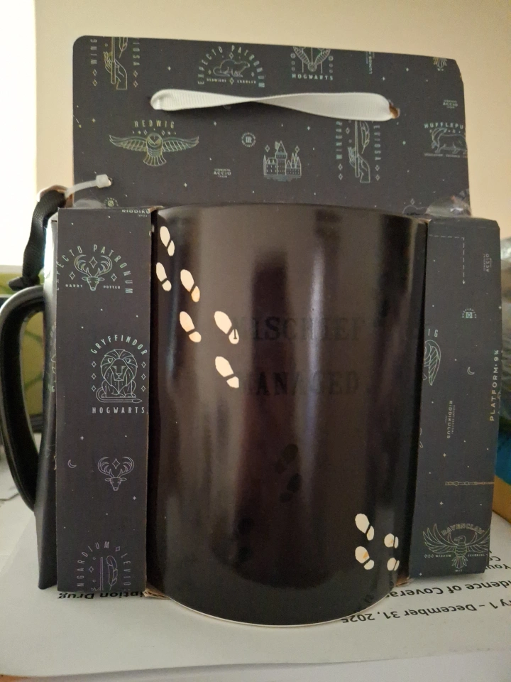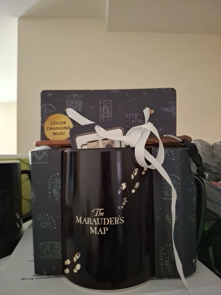 Selling a Harry Potter Marauder's Map color changing mug! The mug features the iconic Marauder's Map design with footprints and the phrase "Mischief Managed" on the front and back. It's a fun and magical way to enjoy your favorite hot beverages. Artwork is revealed with hot beverages .