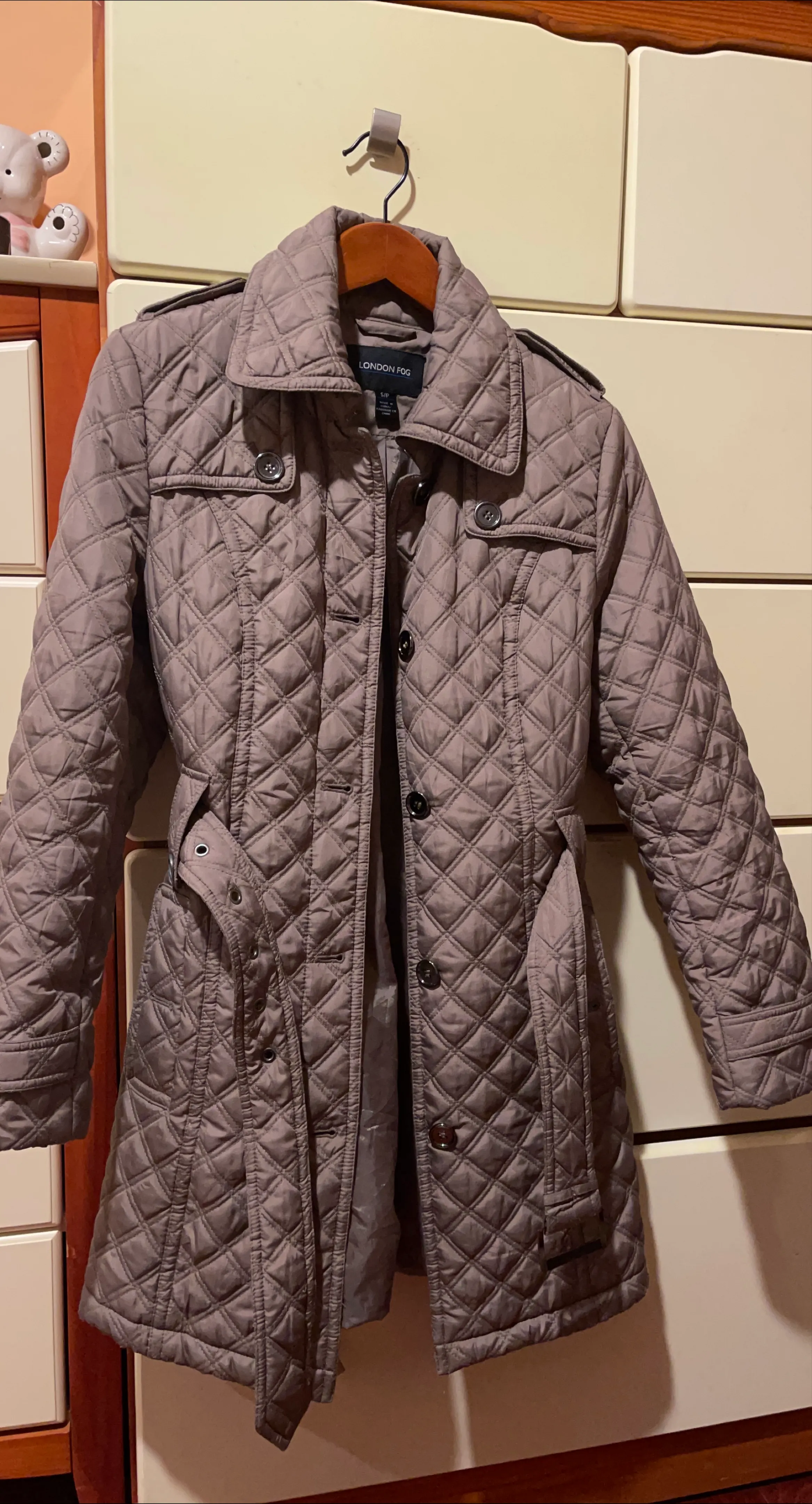 London Fog quilted trench coat in size S/P. It's a stylish and comfortable coat, perfect for cooler weather. The quilted design adds a touch of elegance, and the trench coat style is classic and versatile