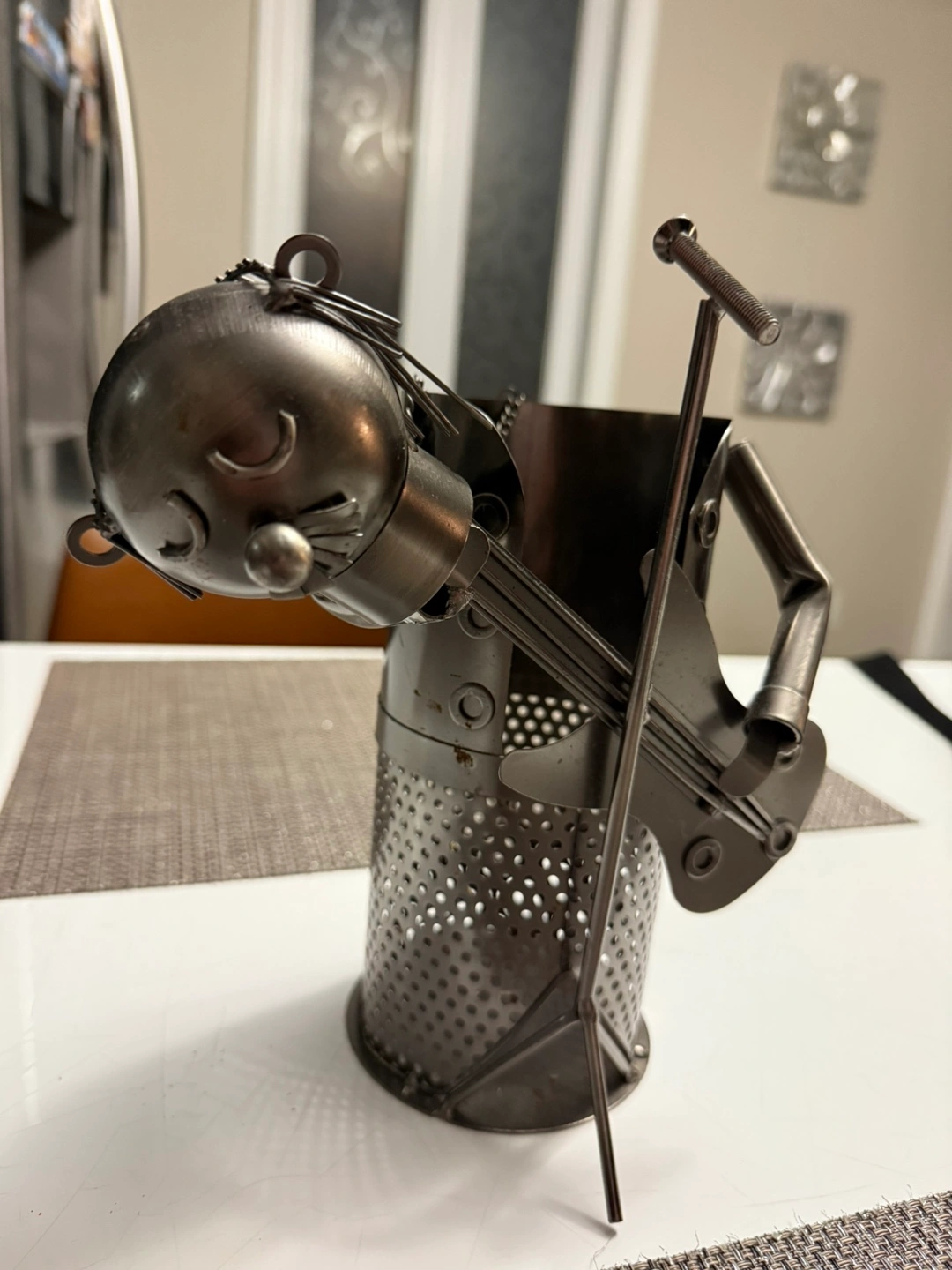 This is a unique metal art sculpture of a guitar player. Wine bottle holder. The sculpture is made of metal and has a rustic, industrial look.