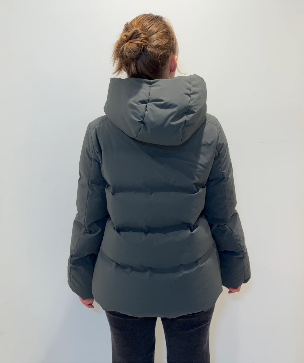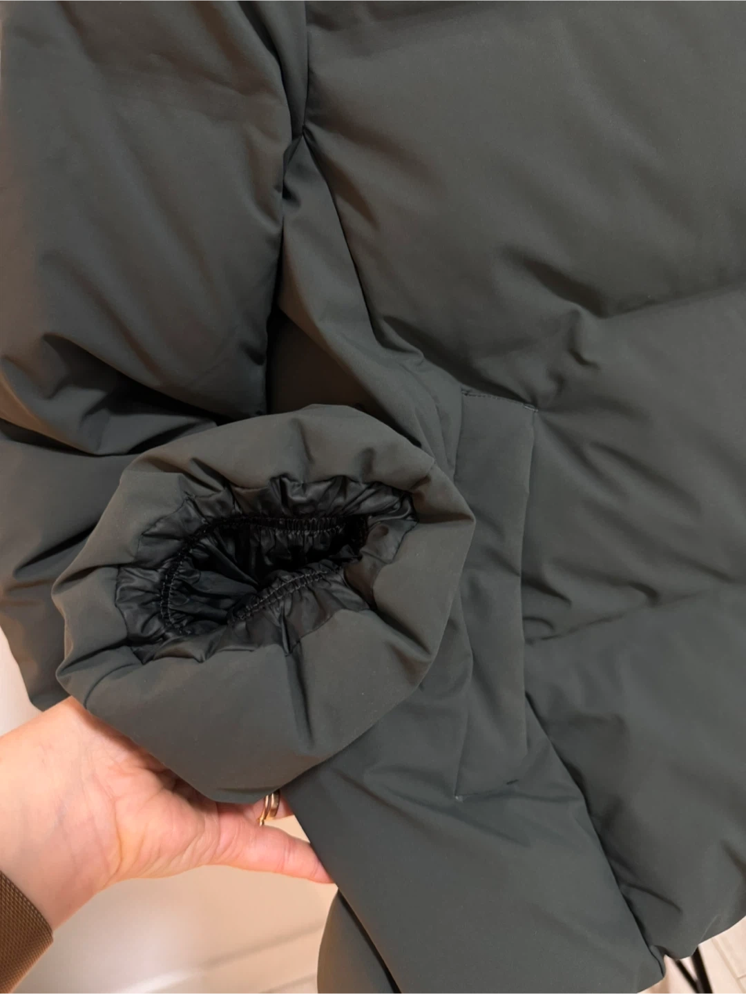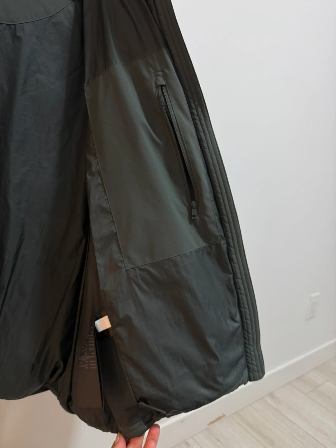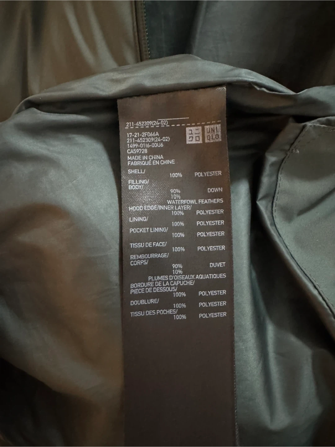 The jacket is made with a shell of 100% polyester and filling of 90% down and 10% waterfowl feathers.