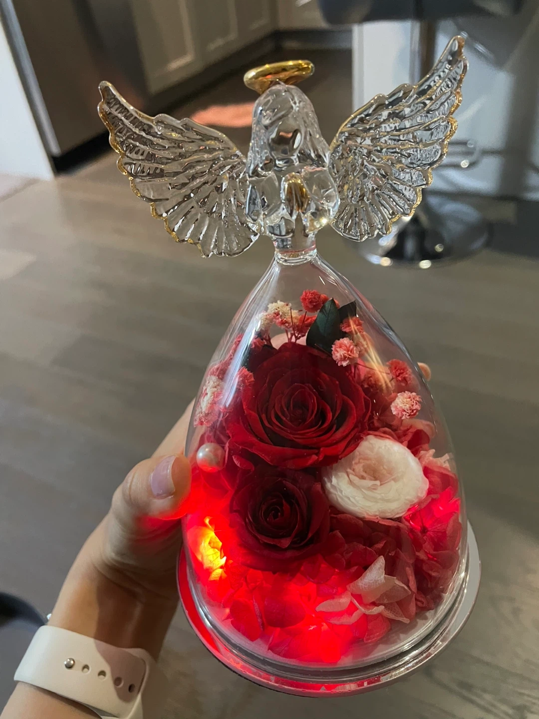 This is a beautiful Angel Rose preserved flower figurine! It's in excellent condition and comes with the original box. The angel figurine is encased in glass and contains preserved roses. This would make a wonderful addition to any room!