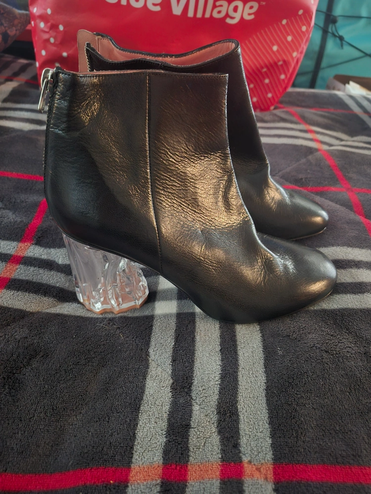 Selling a pair of Acne Studios Vera clear heel booties in size 36, which is a US size 6. These stylish black leather boots feature a unique clear heel. They were originally purchased at Holt Renfrew for $1080.00