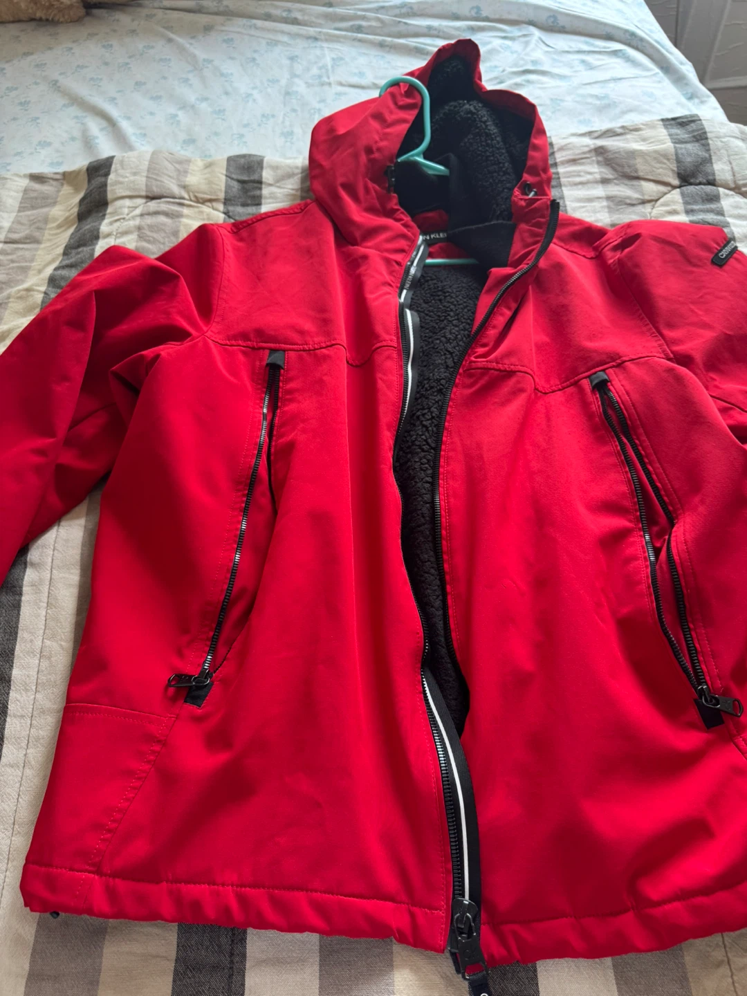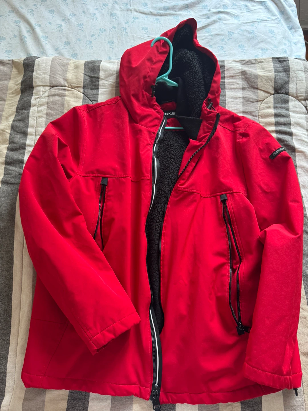 Selling a vibrant red Calvin Klein hooded winter jacket! It's in great condition and ready to keep you warm. The jacket features a cozy black lining and several zippered pockets.