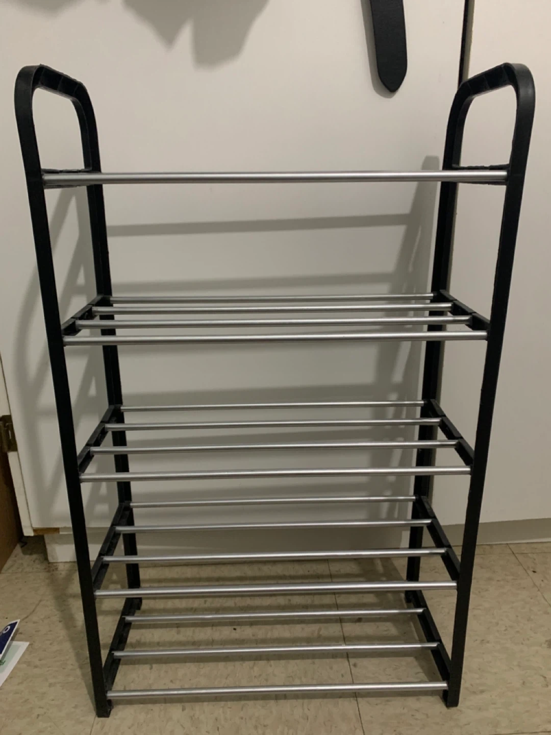 Selling a handy 4-tier shoe rack! It's perfect for keeping your entryway or closet organized. The rack is in great shape and ready for a new home. It features a black frame with silver bars.