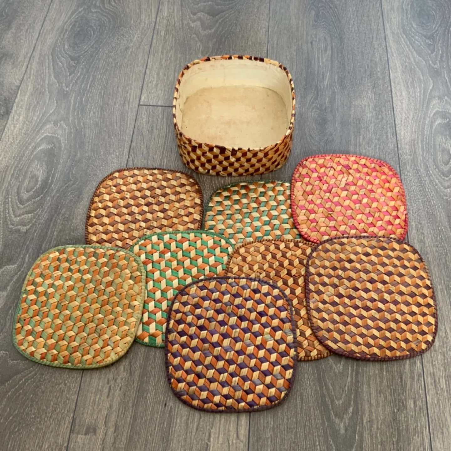Selling a set of woven coasters and a matching basket. The coasters have a cool geometric pattern and come in different colours. The basket is square and about 8 inches across. Perfect for adding a bit of natural texture to your home!