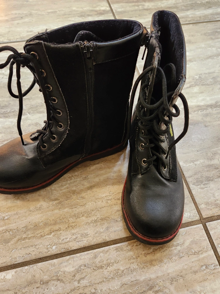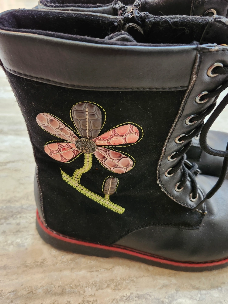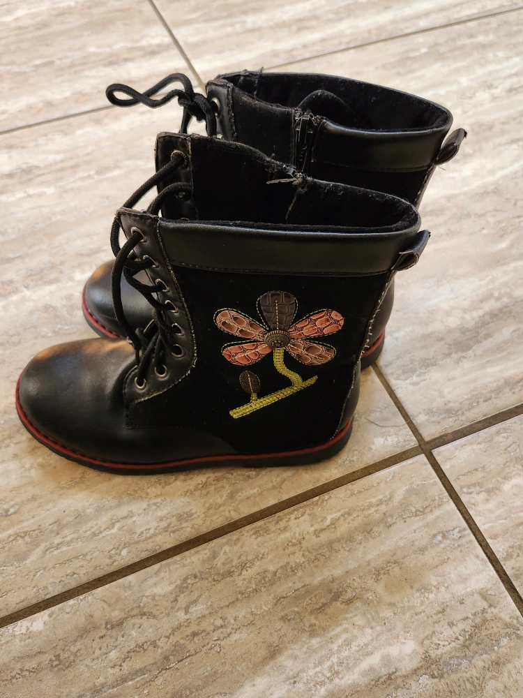 Selling a pair of black spring/fall boots in size 2. They have a cute flower design on the side and laces up the front. Perfect for your little one!