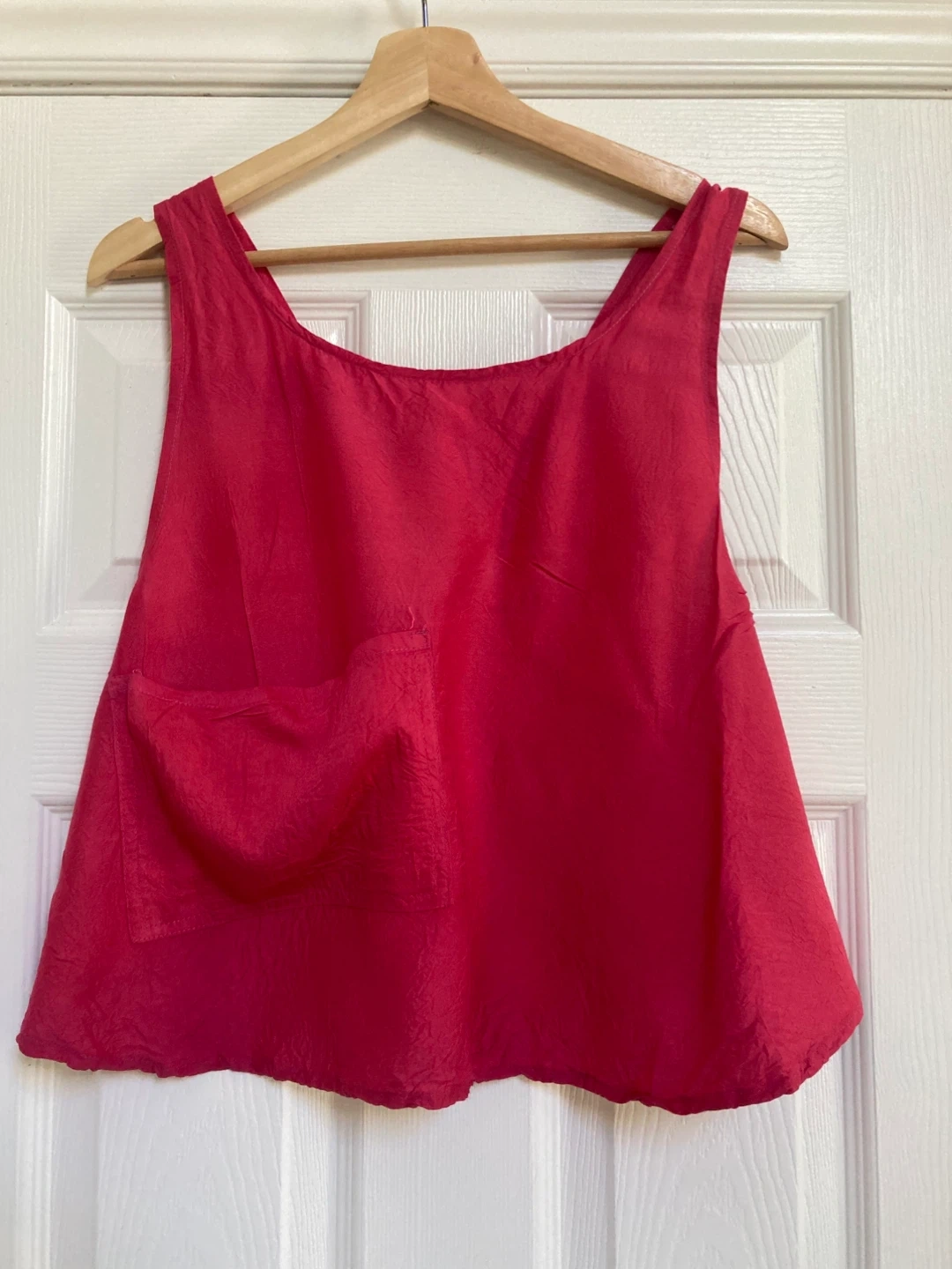 Has front pocket, criss cross back. Made of Bangladeshi silk. There is no brand or label because I had the fabric tailored into this top.