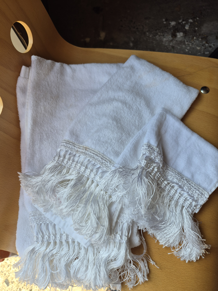 Selling a soft, white towel with decorative fringe. It's in great condition and ready for a new home. Perfect for adding a touch of elegance to your bathroom or as a cozy addition to your guest room